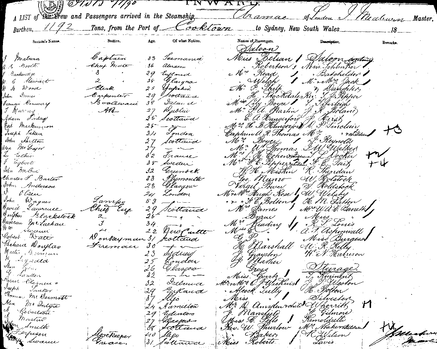 Source: State Records Authority of New South Wales: Shipping Master's Office; Passengers Arriving 1855 - 1922; NRS13278, [X203] reel 495.   Transcribed by Gloria Sheehan.