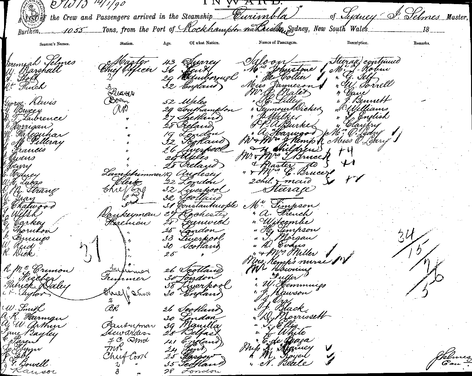 EURIMBLAOF SYDNEY, JEREMIAH SELMES, MASTER, BURTHEN 1055 TONS FROM THE PORT OF ROCKHAMPTON VIA BRISBANE TO SYDNEY NEW SOUTH WALES, JANUARY 1890 |