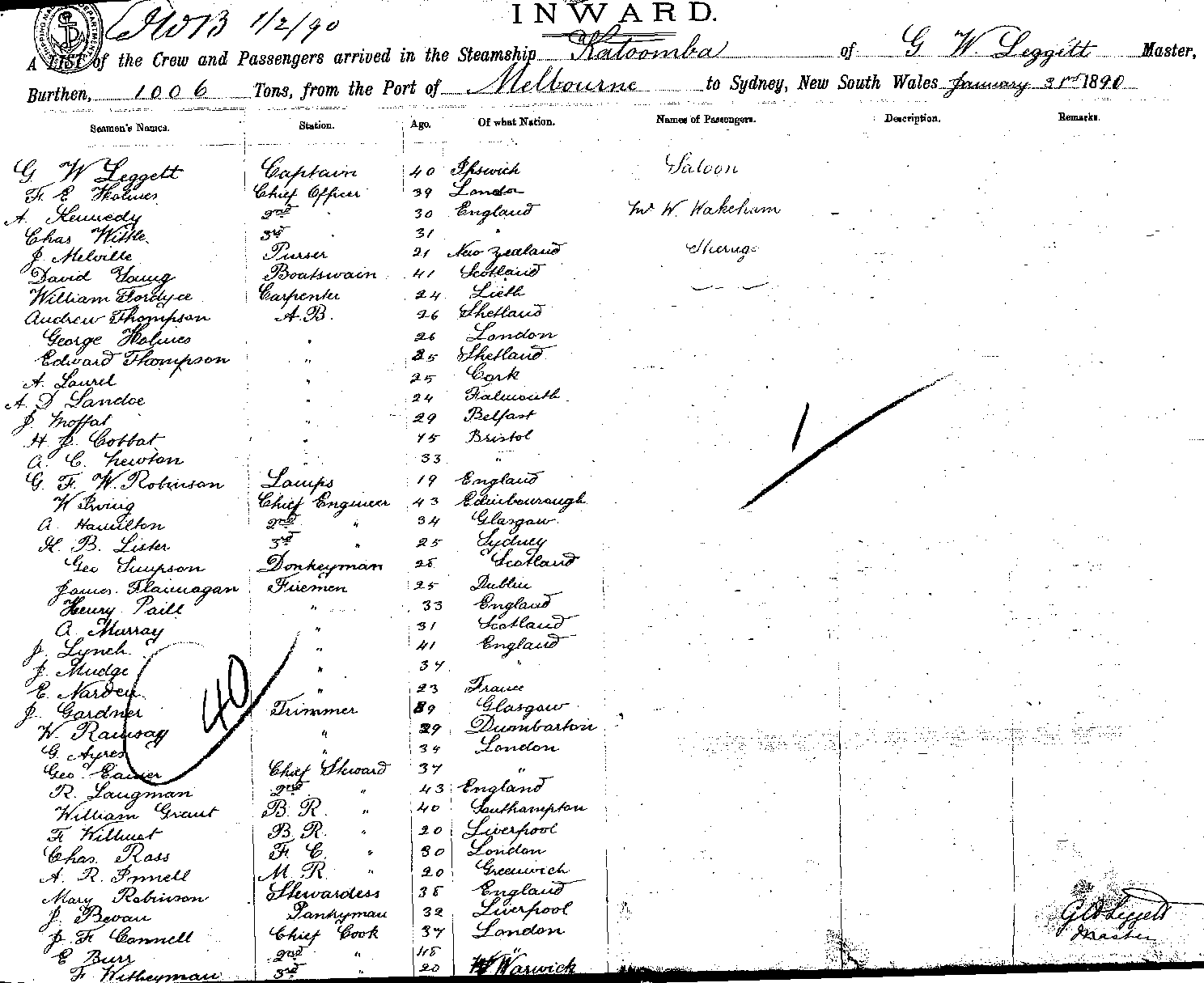KATOOMBAOF ?, G W LEGGETT, MASTER, BURTHEN 1006 TONS FROM THE PORT OF MELBOURNE TO SYDNEY NEW SOUTH WALES, 31 JANUARY 1890 |