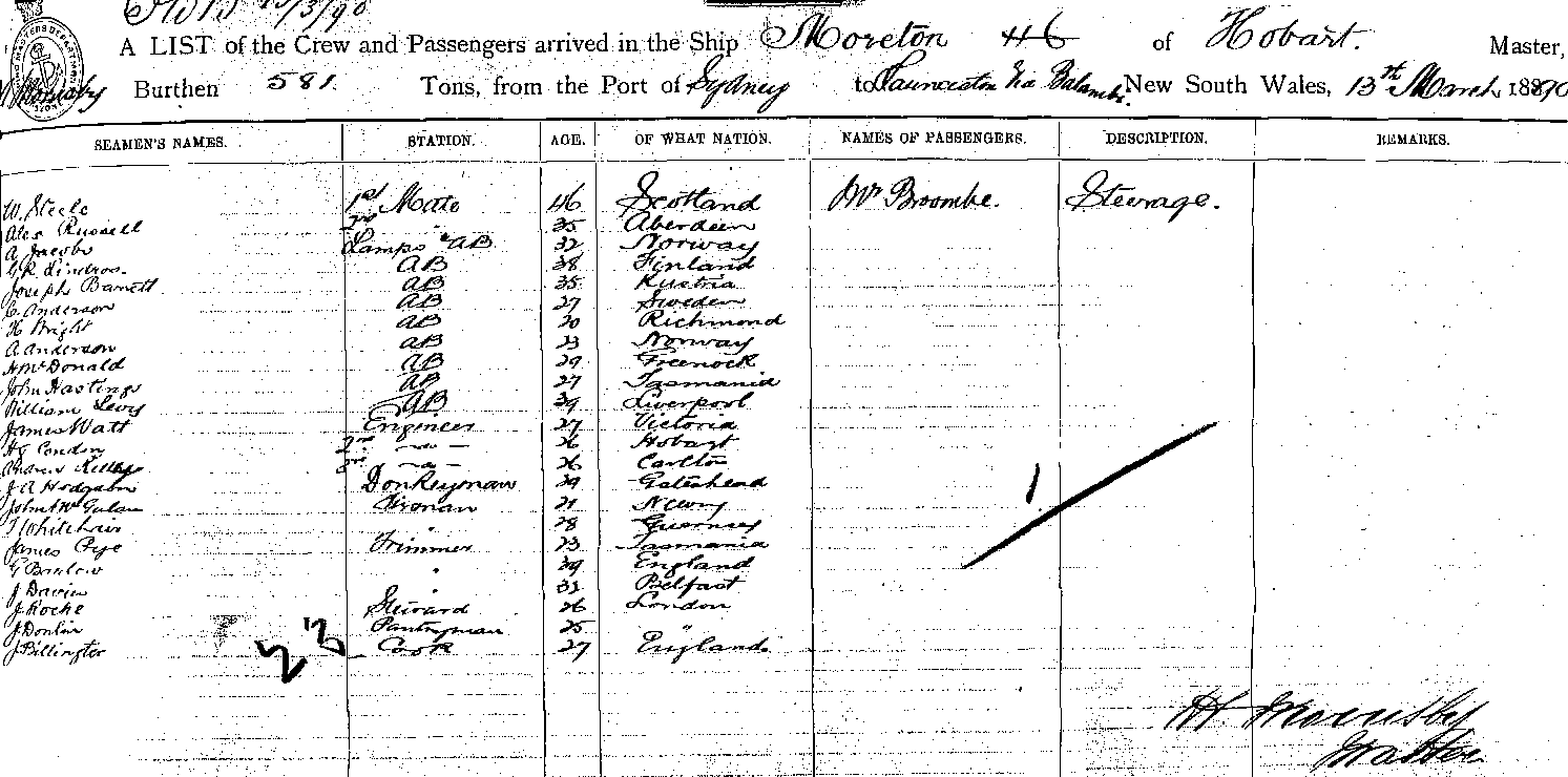 MORETONOF HOBART, H. MORRISBY, MASTER, BURTHEN 581 TONS FROM THE PORT OF SYDNEY TO LAUNCESTON VIA BALAMBI ? 13TH MARCH 1890 |
