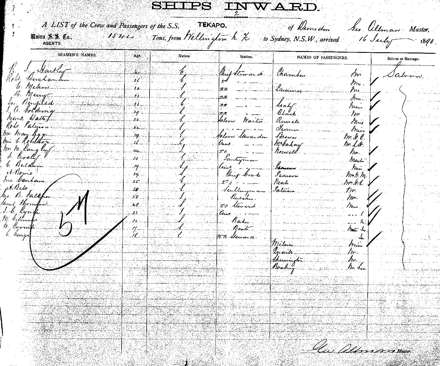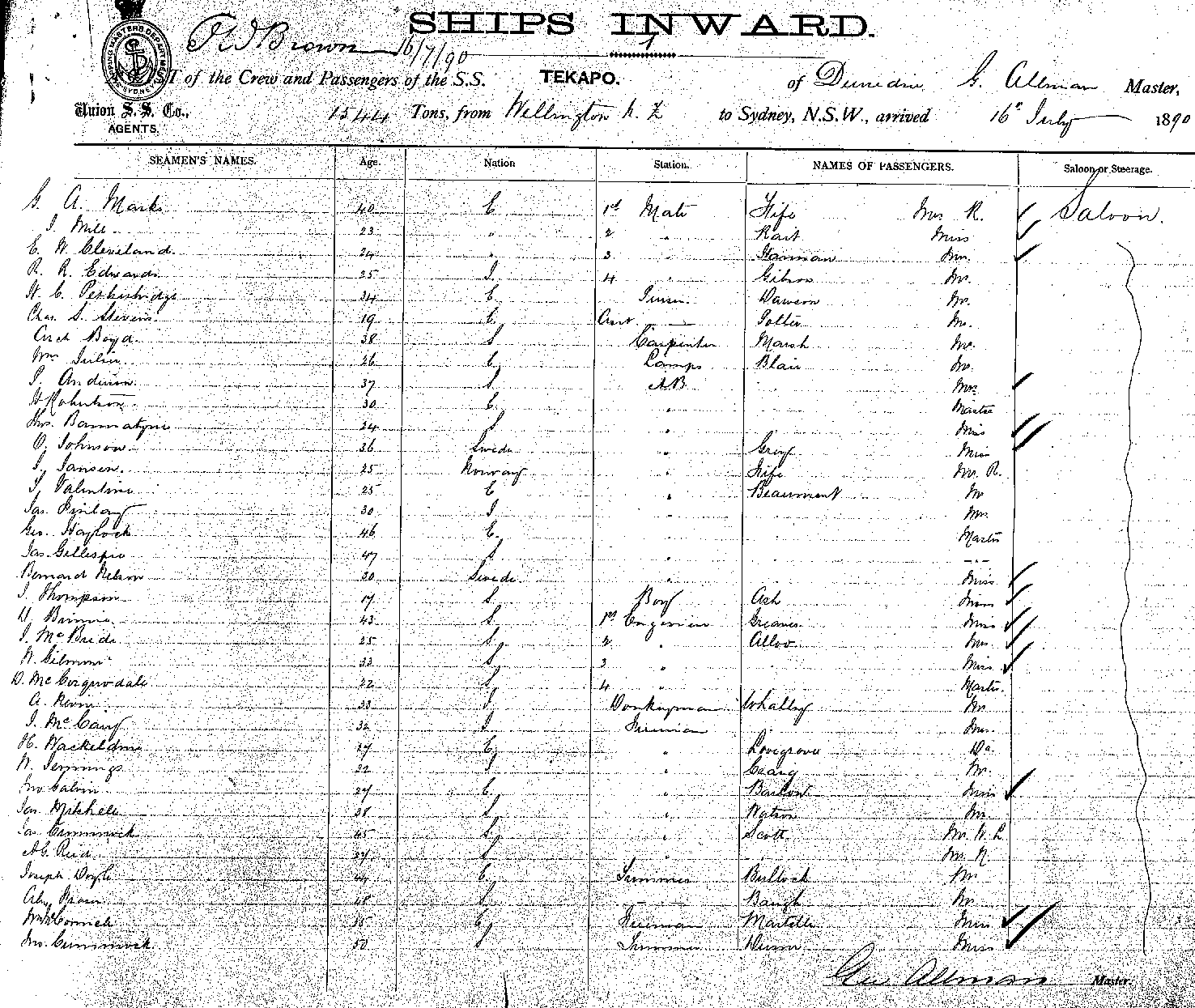 TEKAPOOF DUNEDIN, GEO ALLMAN, MASTER, BURTHEN 1544 TONS FROM THE PORT WELLINGTON TO SYDNEY, NEW SOUTH WALES, 16TH JULY, 1890 |