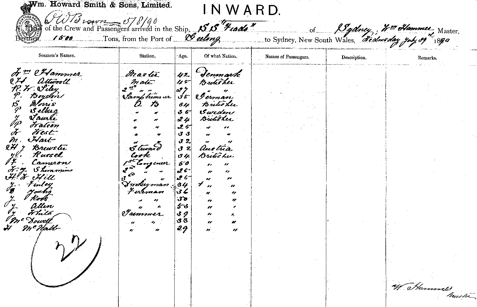 FIADOSTEAMSHIP OF SYDNEY, WILLIAM HAMMER, MASTER, BURTHEN 1500 TONS FROM THE PORT OF GEELONG TO SYDNEY, NEW SOUTH WALES, 29TH JULY, 1890 |