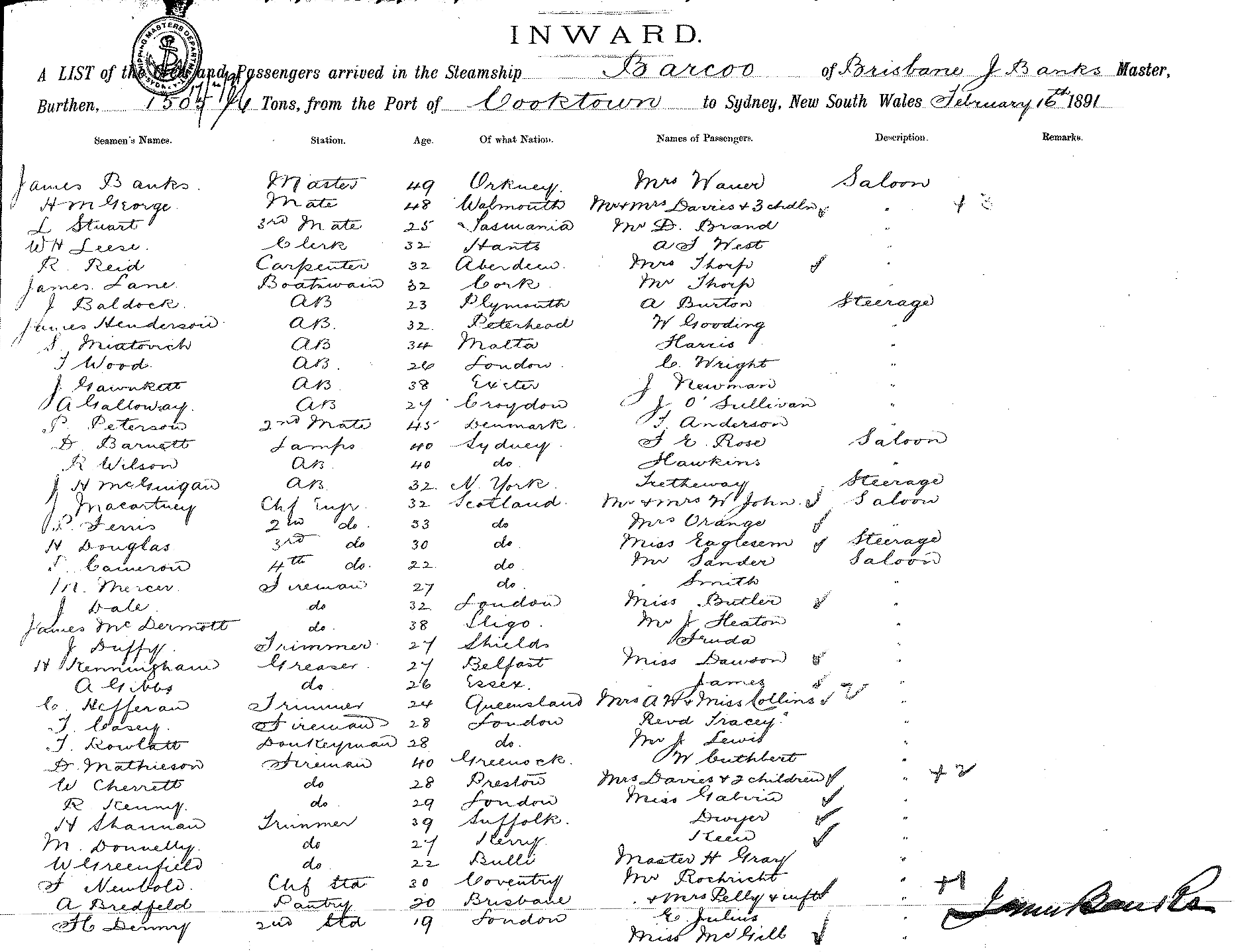 BARCOOOF BRISBANE, J. BANKS, MASTER, BURTHEN 1505 TONS FROM THE PORT OF COOKTOWN TO SYDNEY, NEW SOUTH WALES, 16TH FEBRUARY 1891 |