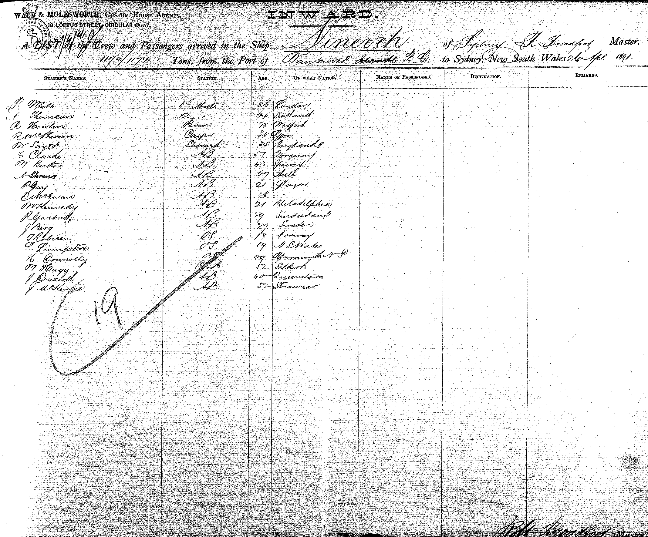 NINEVEHof Sydney, R. BROADFOOT, Master, Burthen 1174 Tons from the Port of VANCOUVER to SYDNEY, New South Wales, 26th April, 1891 |