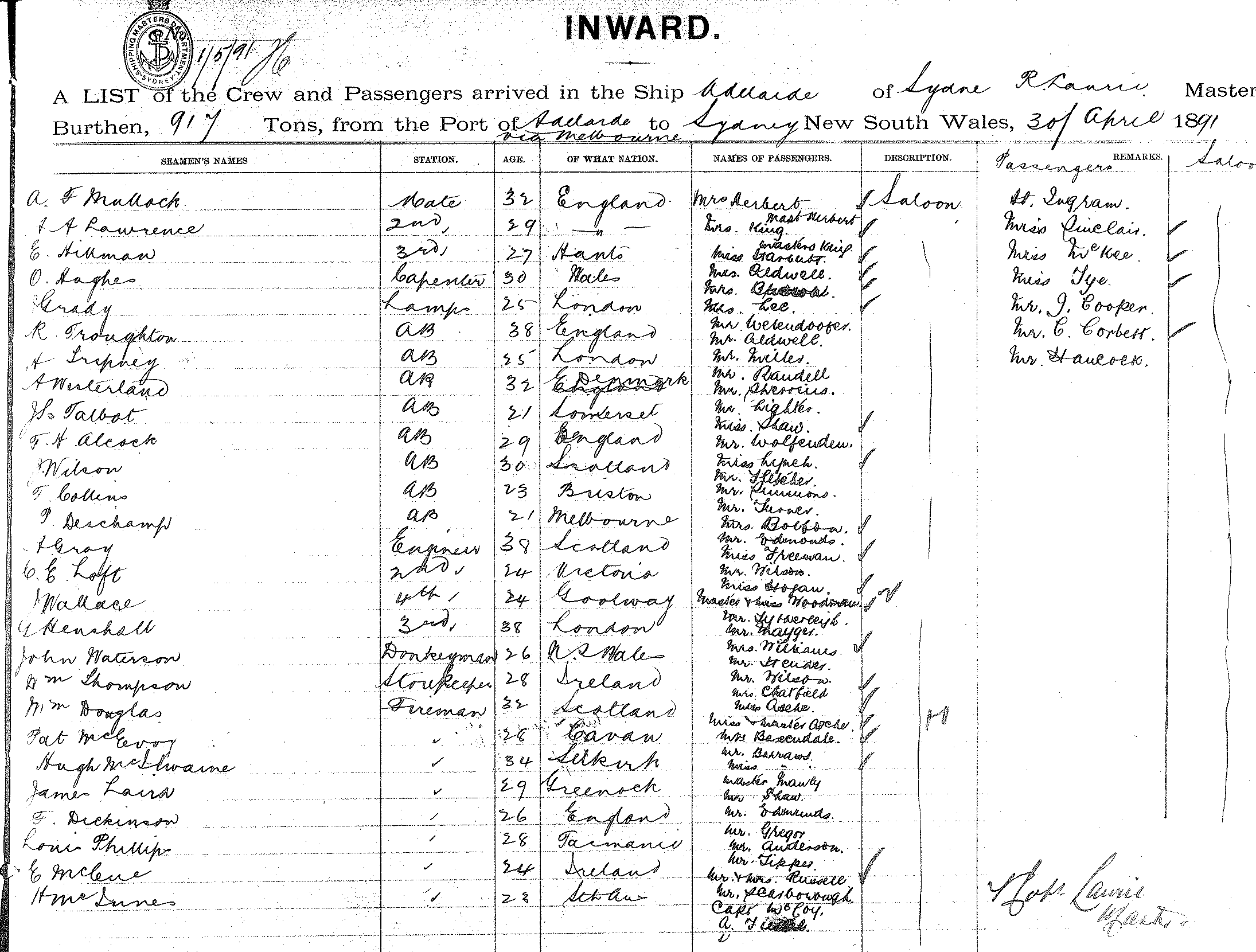 ADELAIDEof Sydney, R. LAURIE, Master, Burthen 917 Tons from the Port of ADELAIDE via Melbourne to SYDNEY, New South Wales, 30th April, 1891 |