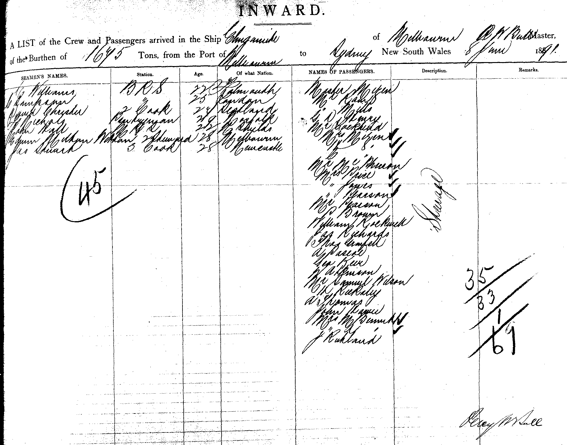 ELINGAMITEOF MELBOURNE, P. W. BULL, MASTER, BURTHEN 1675 TONS FROM THE PORT OF MELBOURNE TO SYDNEY, TH WALES, 8TH JUNE 1891 |