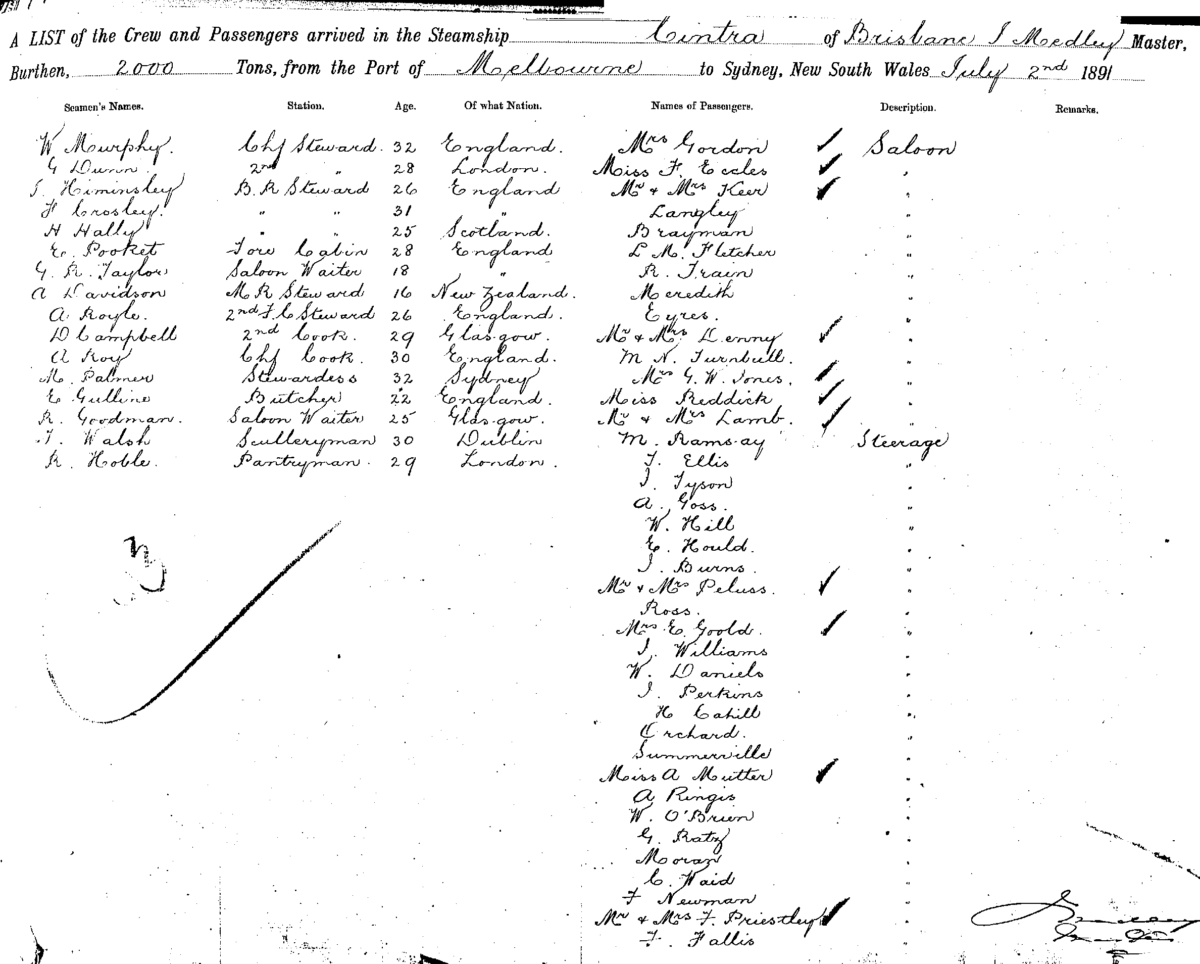 CINTRAOF BRISBANE, J. MEDLEY, MASTER, BURTHEN 2000 TONS FROM THE PORT OF MELBOURNE TO SYDNEY, NEW SOUTH WALES, 2ND JULY 1891 |