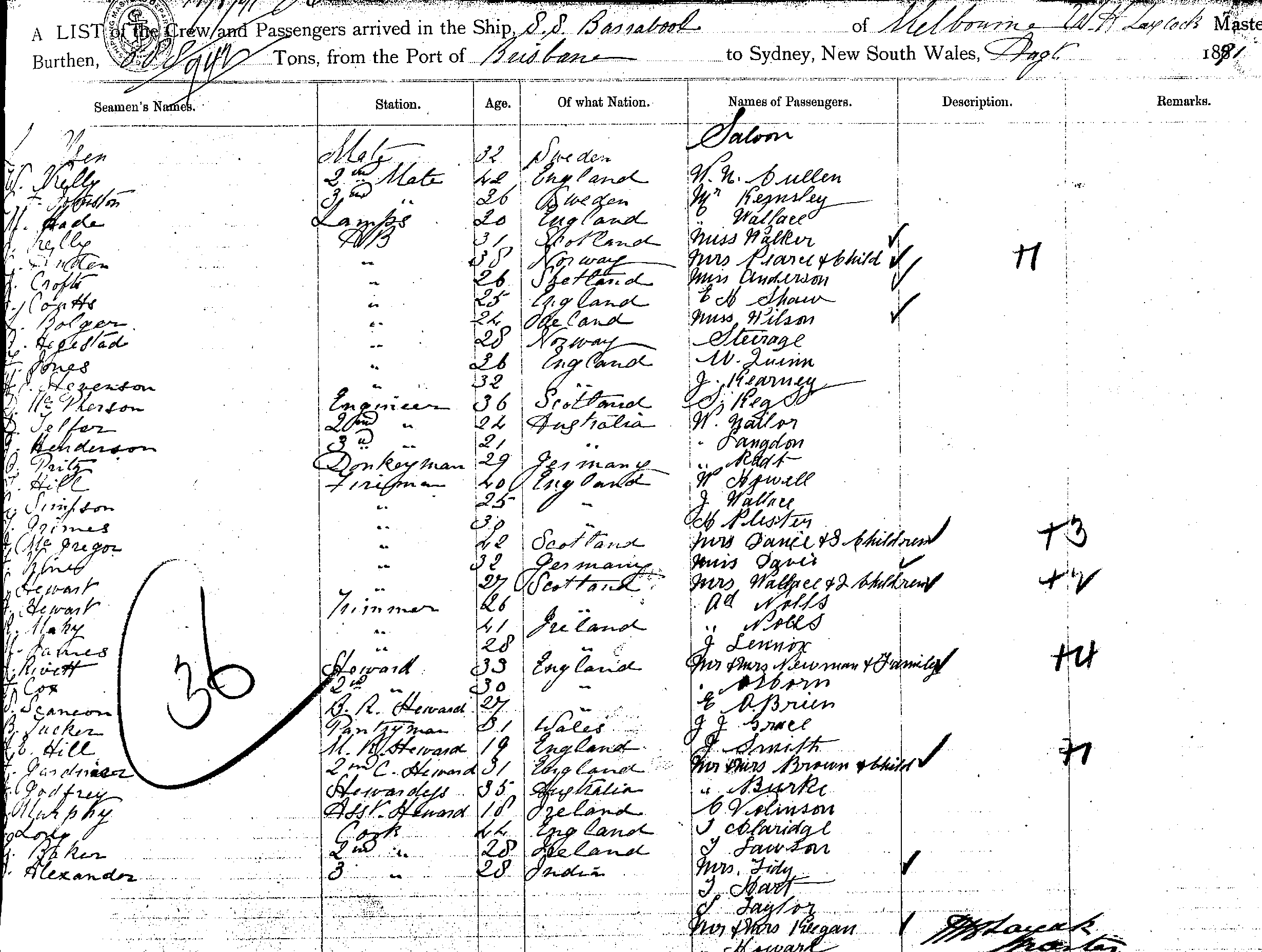 Source: State Records Authority of New South Wales: Shipping Master's Office; Passengers Arriving 1855 - 1922; NRS13278, [X212-X213] reel 504 & 505. Transcribed by Jack Batchler. You may view/print a scan of the original list - a monitor set to high resolution is recommended for clarity. Use your back button to return. |