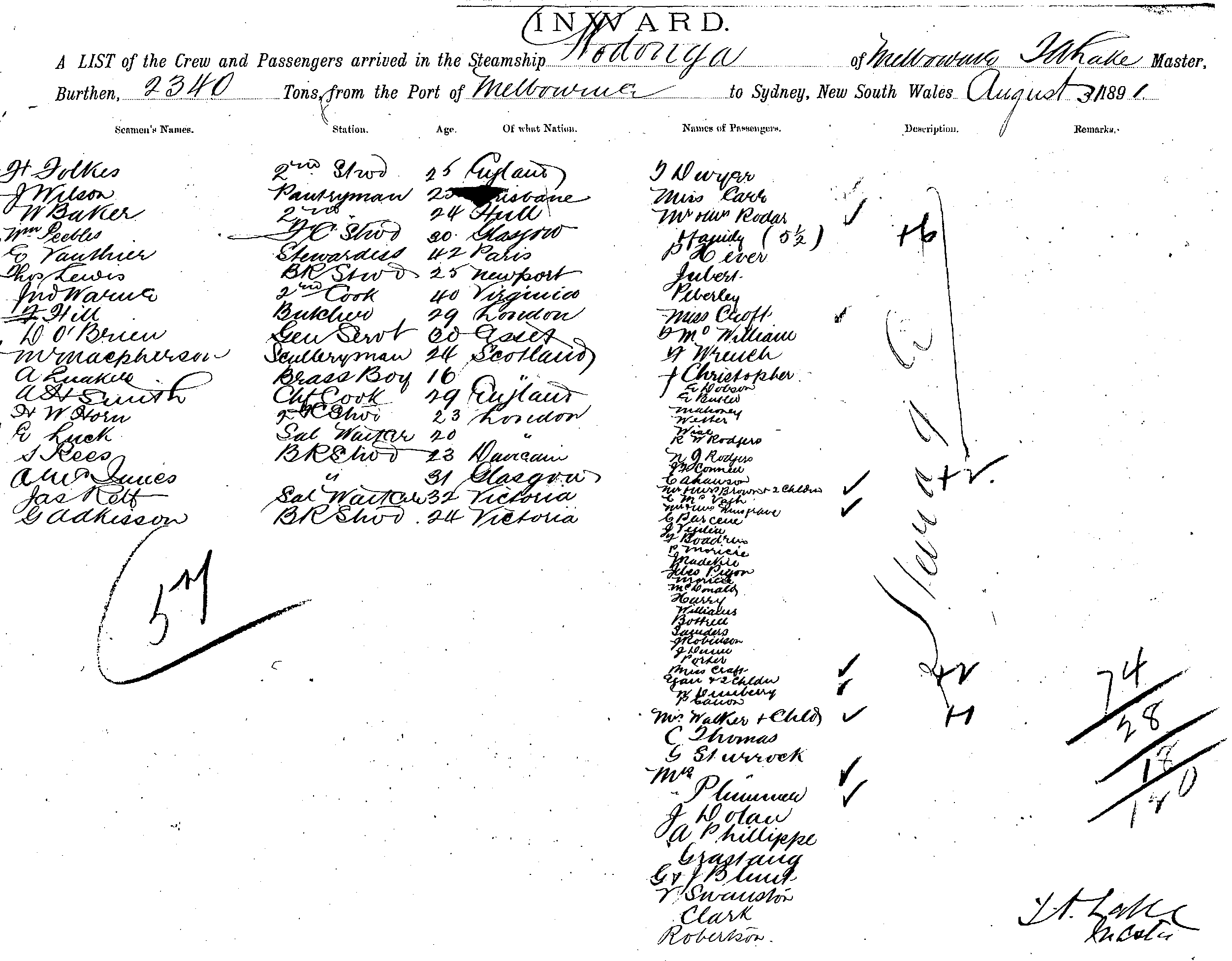 Source: State Records Authority of New South Wales: Shipping Master's Office; Passengers Arriving 1855 - 1922; NRS13278, [X212-X213] reel 504 & 505. Transcribed by Jack Batchler. You may view/print a scan of the original list - a monitor set to high resolution is recommended for clarity. Use your back button to return. |