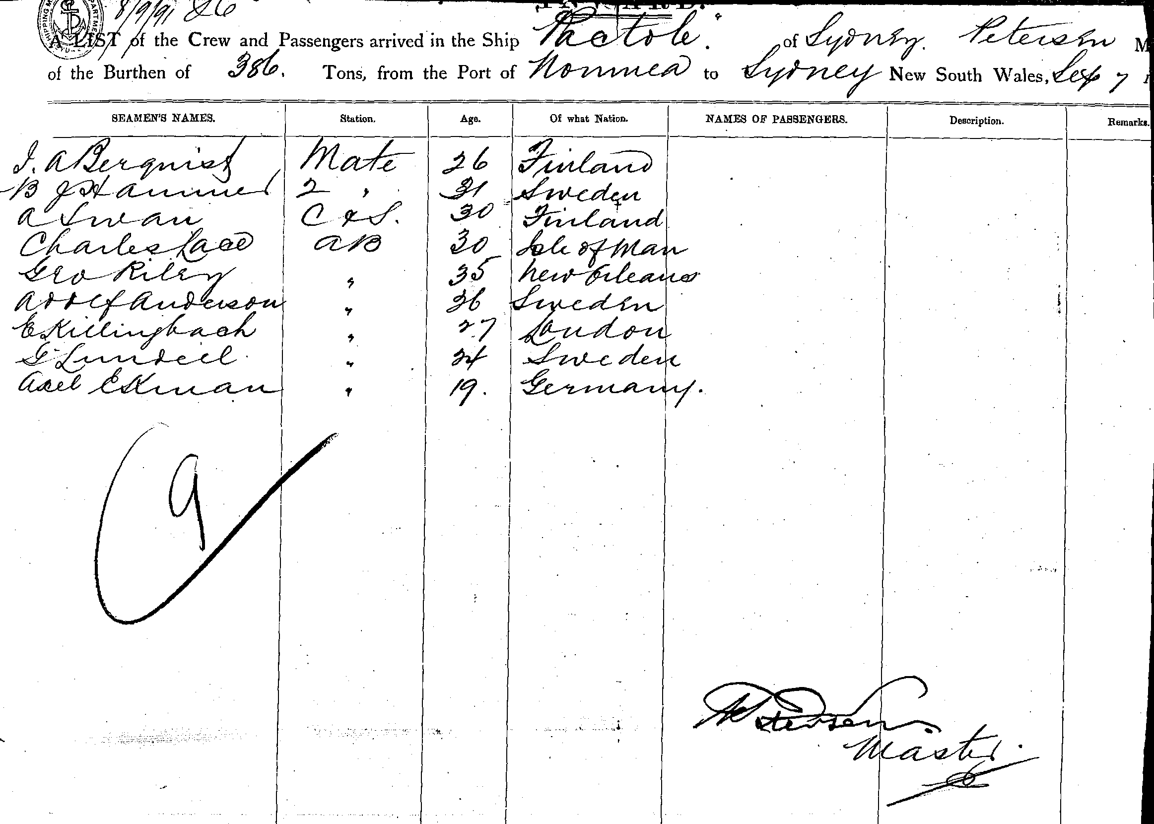 PACTOLEOF SYDNEY, PETERSEN, MASTER, BURTHEN 386 TONS FROM THE PORT OF NOUMEA TO SYDNEY, NEW SOUTH WALES, 7TH SEPTEMBER, 1891?