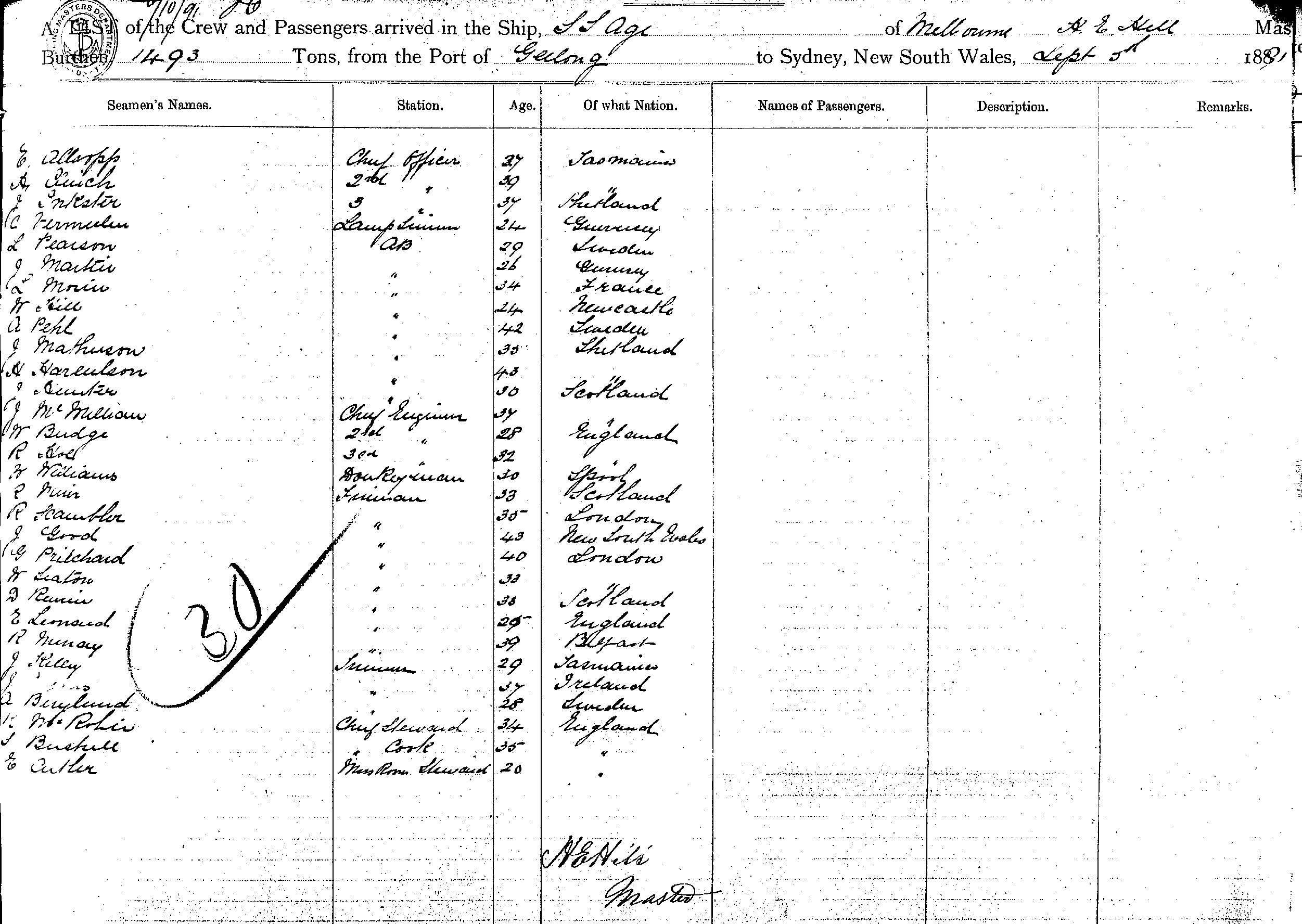 AgeOF MELBOURNE, H E HILL, MASTER, BURTHEN 1493 TONS FROM THE PORT OF GEILONG TO SYDNEY, NEW SOUTH WALES, 5TH SEPTEMBER 1891 |