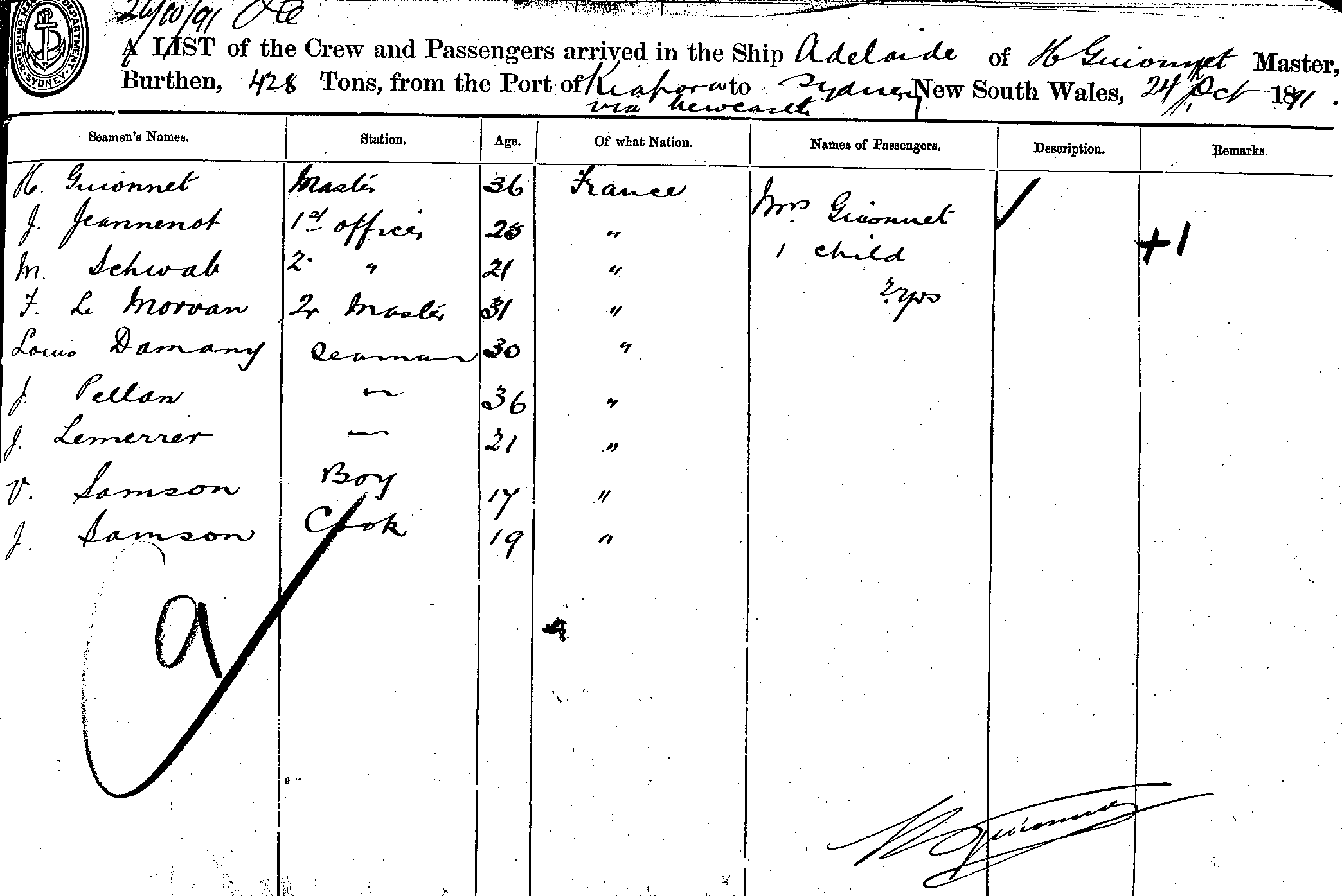 ADELAIDEOF ?, H. GUIONNET, MASTER, BURTHEN 428 TONS FROM THE PORT OF KIAPORA VIA NEWCASTLE TO SYDNEY, NEW SOUTH WALES, 24TH OCT 1891 |