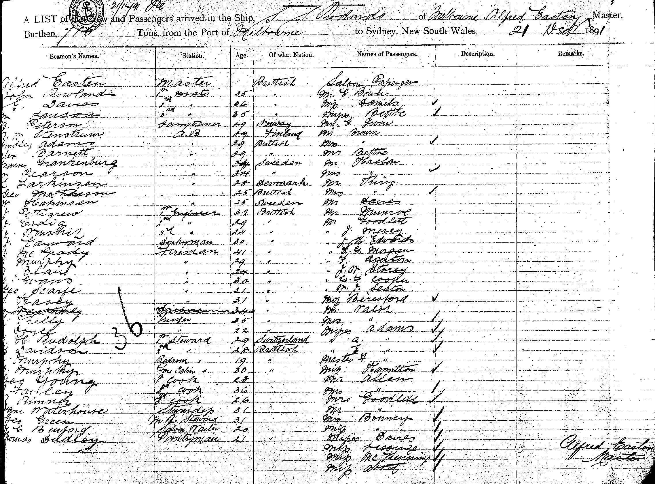 RODONDOOF MELBOURNE, ALFRED EASTEN, MASTER, BURTHEN 715 TONS FROM THE PORT OF MELBOURNE TO SYDNEY, NEW SOUTH WALES, 21 DECEMBER 1891 |