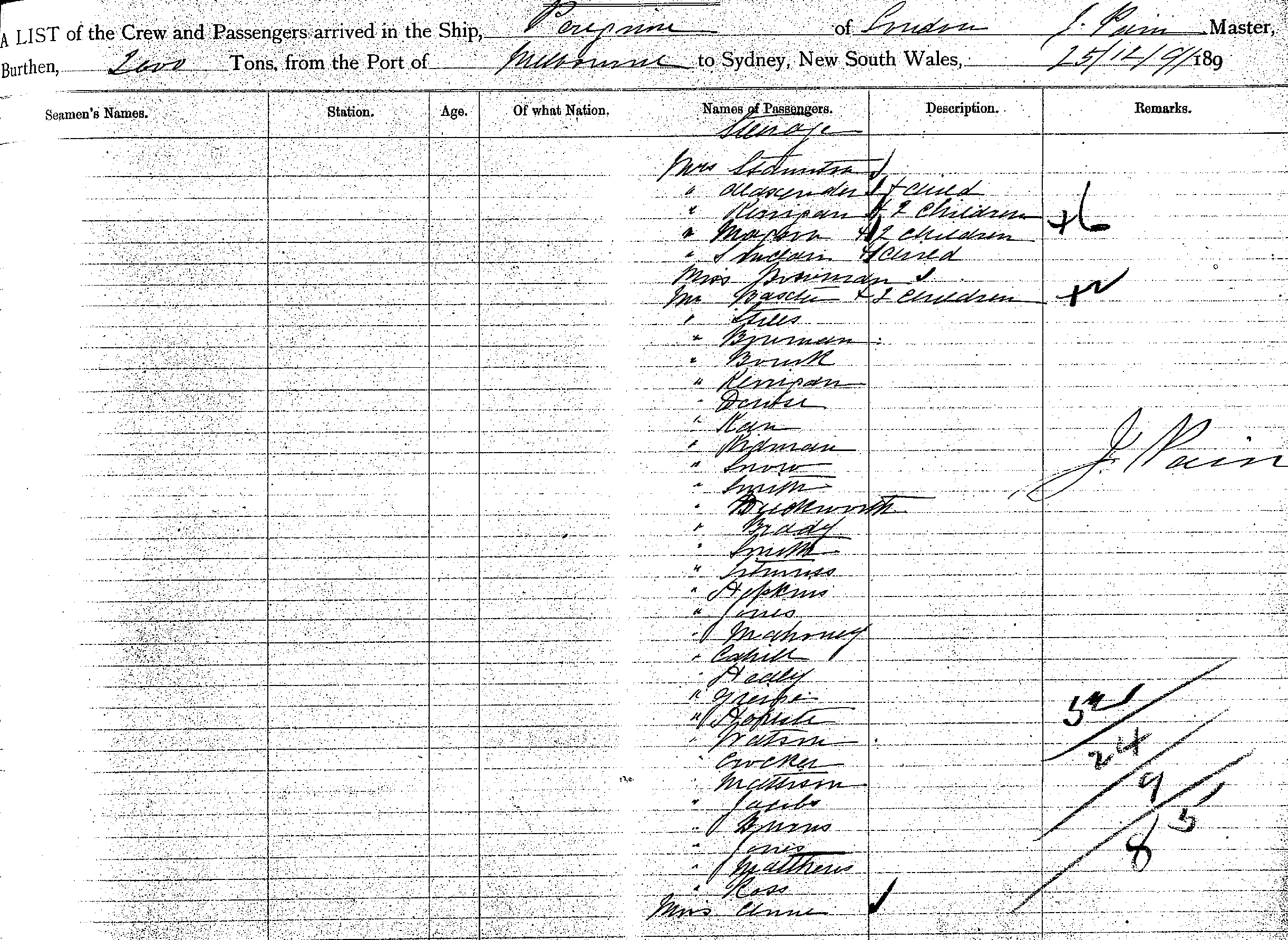 PEREGRINIOF LONDON, J. PAIN, MASTER, BURTHEN 2000 TONS FROM THE PORT OF MELBOURNE TO SYDNEY, NEW SOUTH WALES, 25 DECEMBER 1891 |