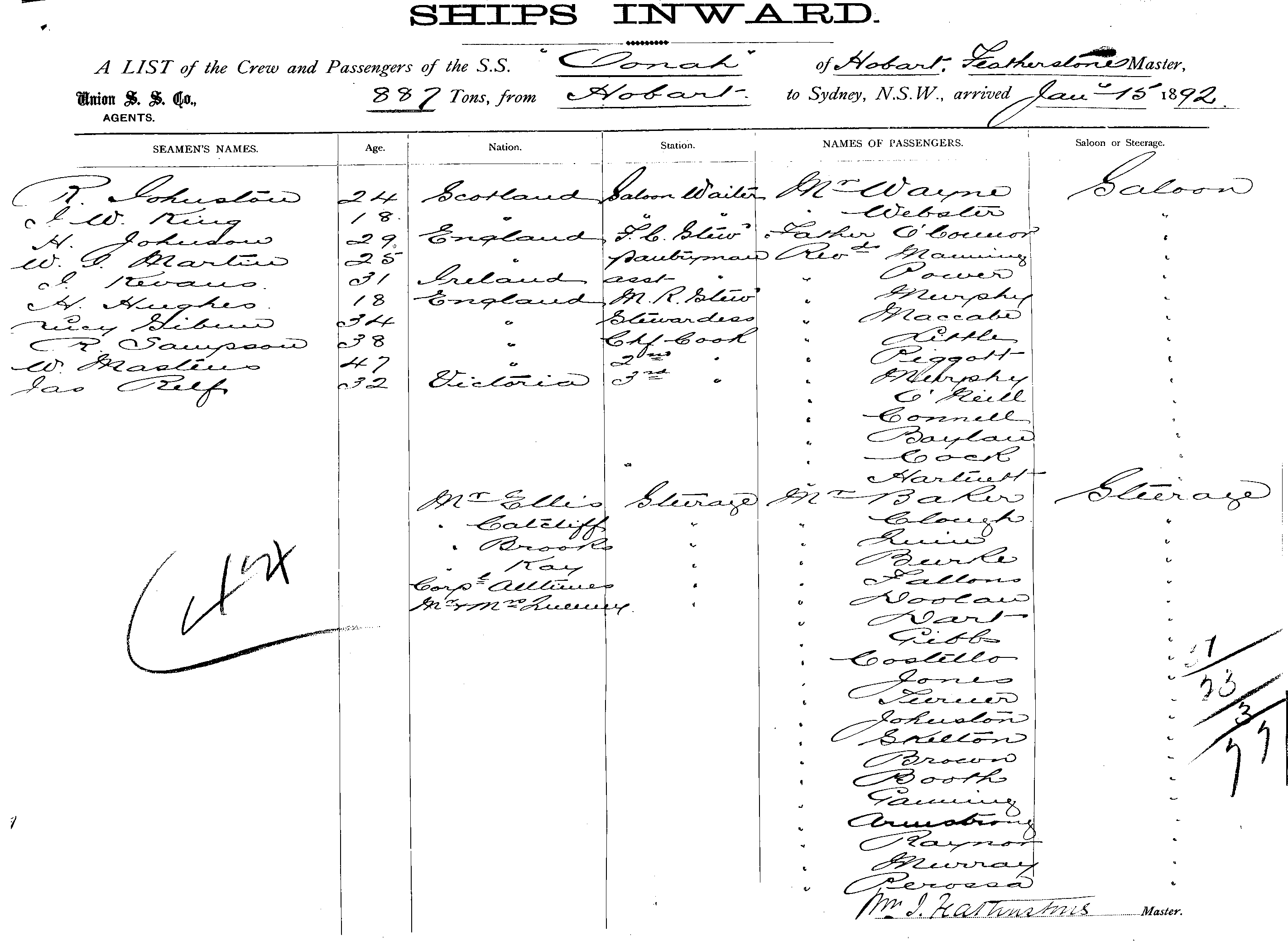 OONAHOF HOBART, WILLIAM J. FEATHERSTONE, MASTER, BURTHEN 887 TONS FROM THE PORT OF HOBART TO SYDNEY, NEW SOUTH WALES, 15TH JANUARY, 1892 |
