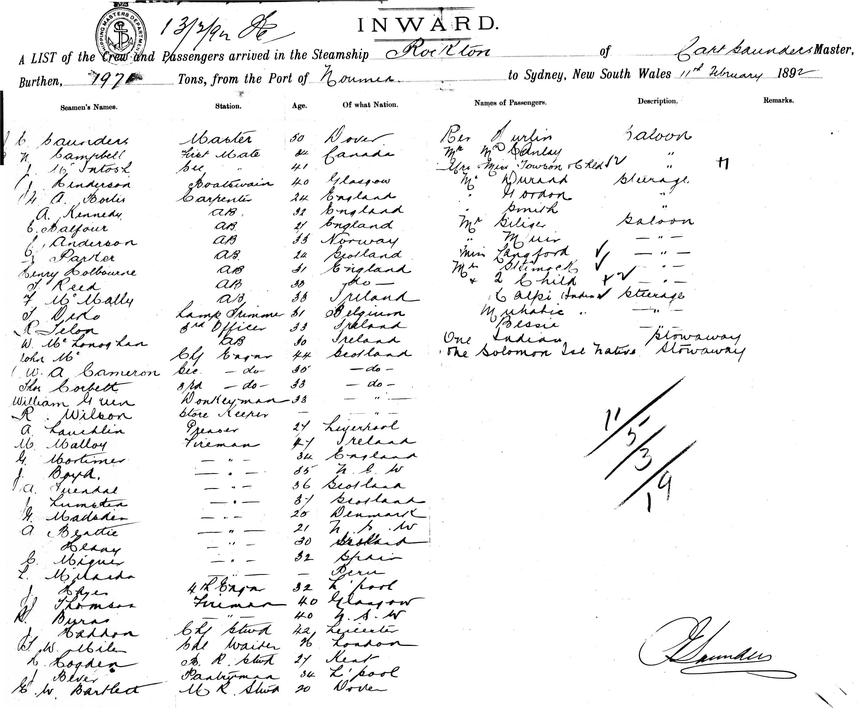 ROCKTONOF ?, C.E. SAUNDERS, MASTER, BURTHEN 1971 TONS, FROM THE PORT OF NOUMEA TO SYDNEY, NEW SOUTH WALES, 11TH FEBRUARY, 1892 |