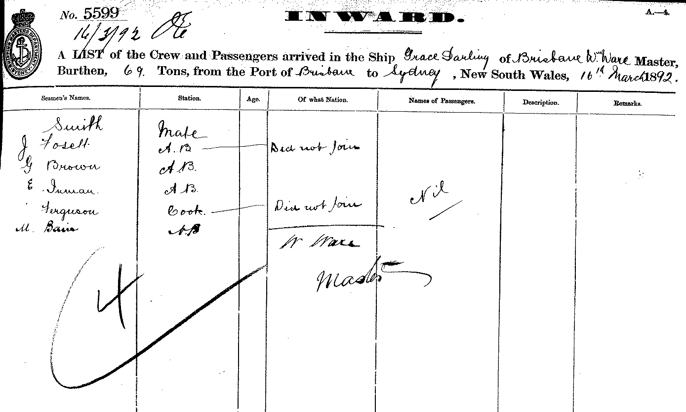 GRACE DARLINGOF BRISBANE, WM. WARE, MASTER, BURTHEN 69 TONS FROM THE PORT OF BRISBANE TO SYDNEY, NEW SOUTH WALES, 16TH MARCH 1892 |