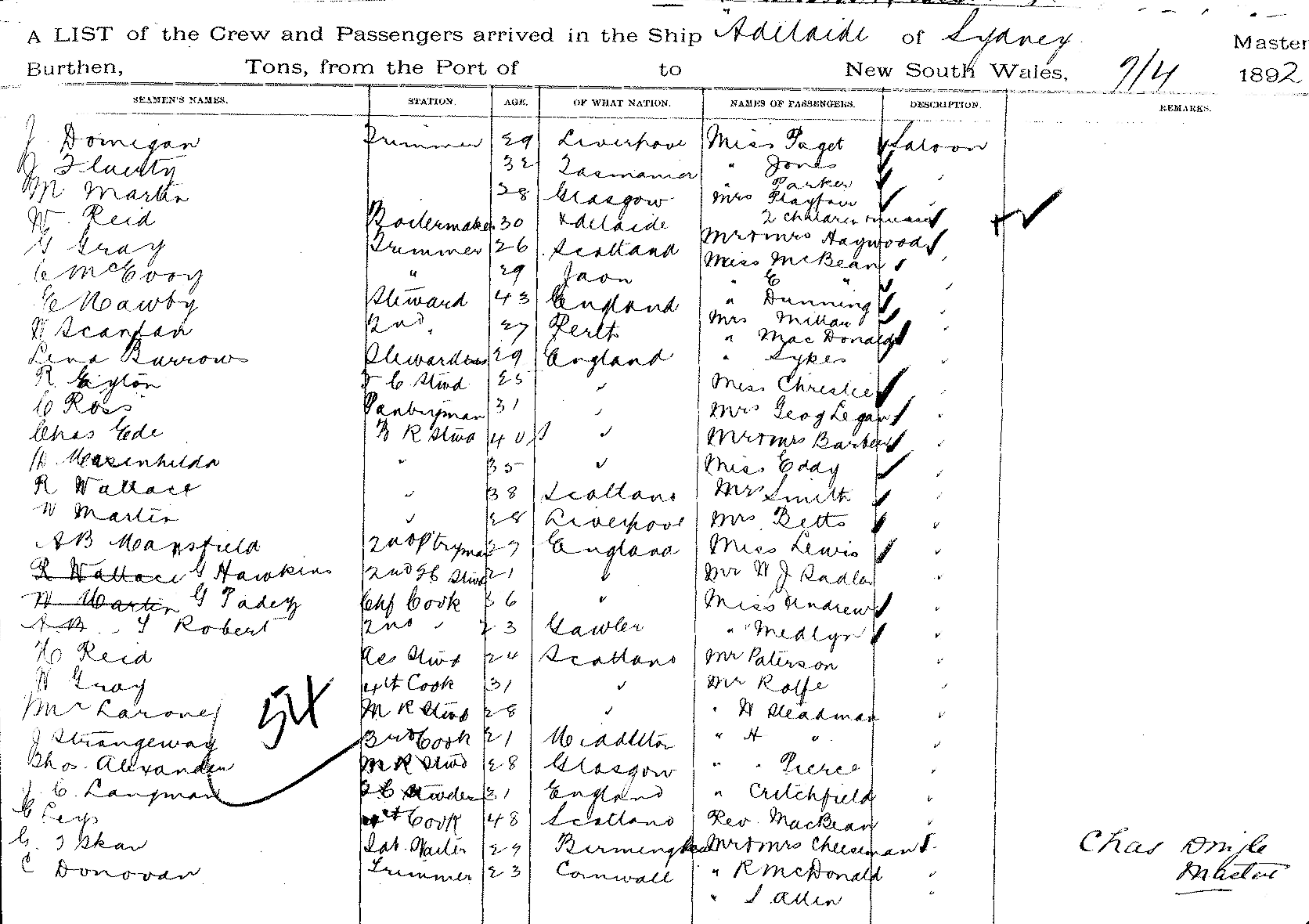 ADELAIDEOF SYDNEY, C DINGLE, MASTER, BURTHEN 717 TONS FROM THE PORT OF ADELAIDE VIA MELBOURNE TO SYDNEY, NEW SOUTH WALES, 7 APRIL 1892 |