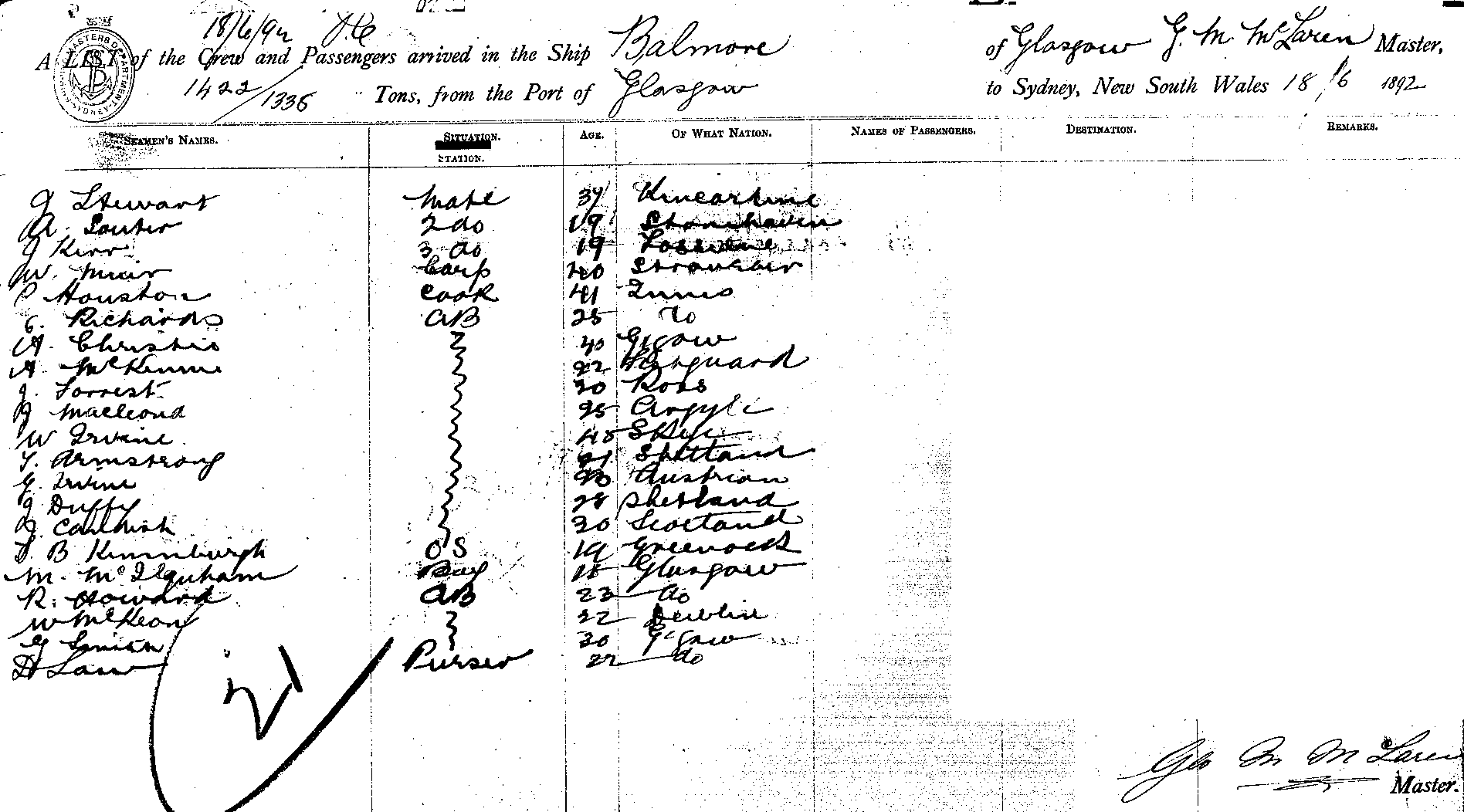 BALMOREOF GLASGOW, G. M. MCLAREN MASTER, BURTHEN 1422/1336 TONS FROM THE PORT OF GLASGOW TO SYDNEY, NEW SOUTH WALES, 18/6 1892 |