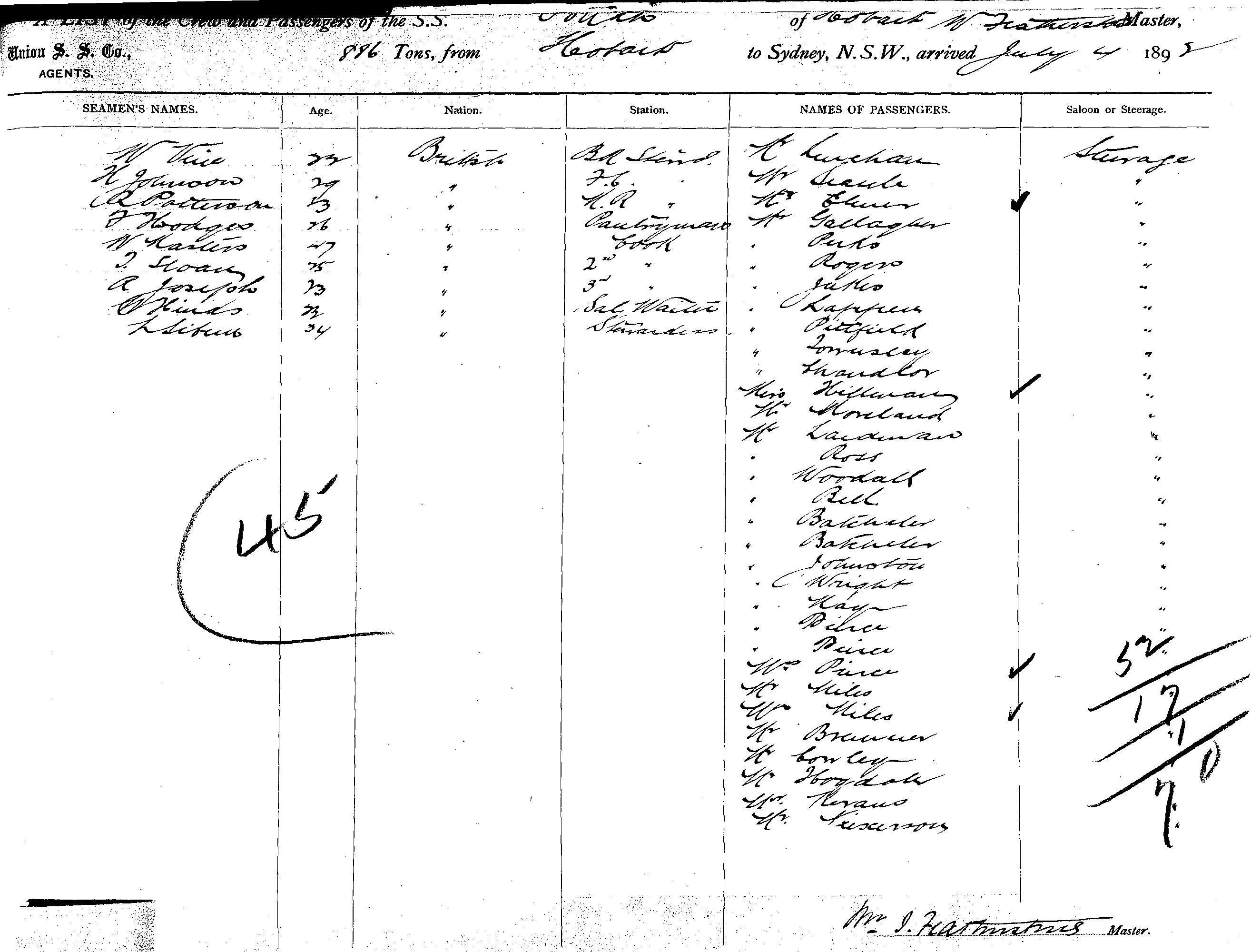 Source: State Records Authority of New South Wales: Shipping Master's Office; Passengers Arriving 1855 - 1922; NRS13278, [X217-218] reel 510. Transcribed by Marilyn Shoesmith. You may view/print a scan of the original list - a monitor set to high resolution is recommended for clarity. Use your back button to return. |