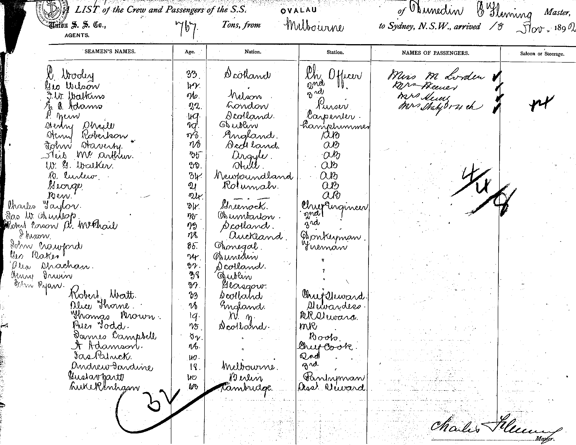 OVALAUOF DUNEDIN, CHARLES FLEMING, MASTER, BURTHEN 767 TONS FROM THE PORT OF MELBOURNE TO SYDNEY, NEW SOUTH WALES, 13 NOVEMBER 1892 |