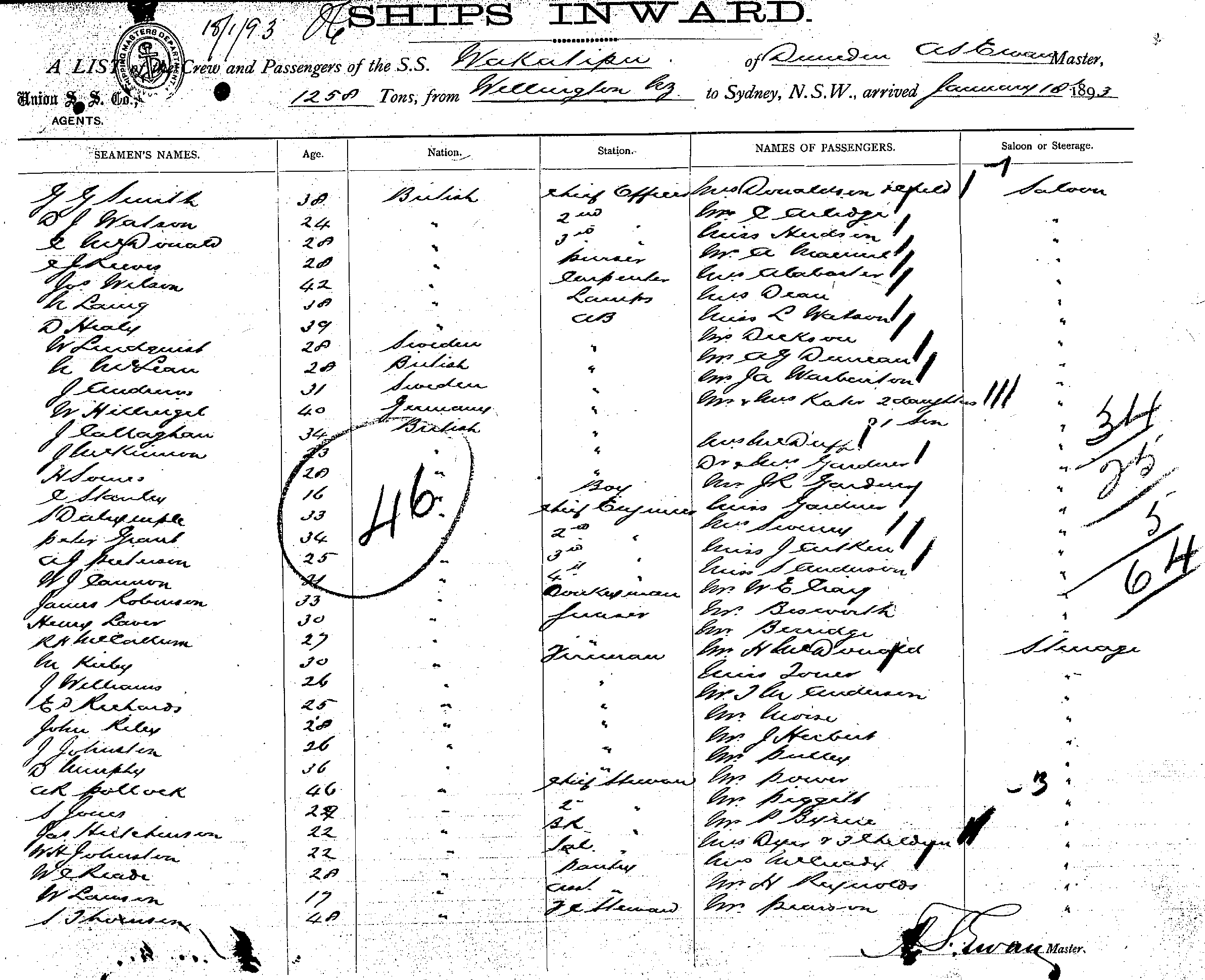 WAKATAPUOF DUNEDIN, A. S. EWAN, MASTER, BURTHEN 1258 TONS FROM THE PORT OF WELLINGTON TO SYDNEY, NEW SOUTH WALES, 18TH JANUARY 1893 |