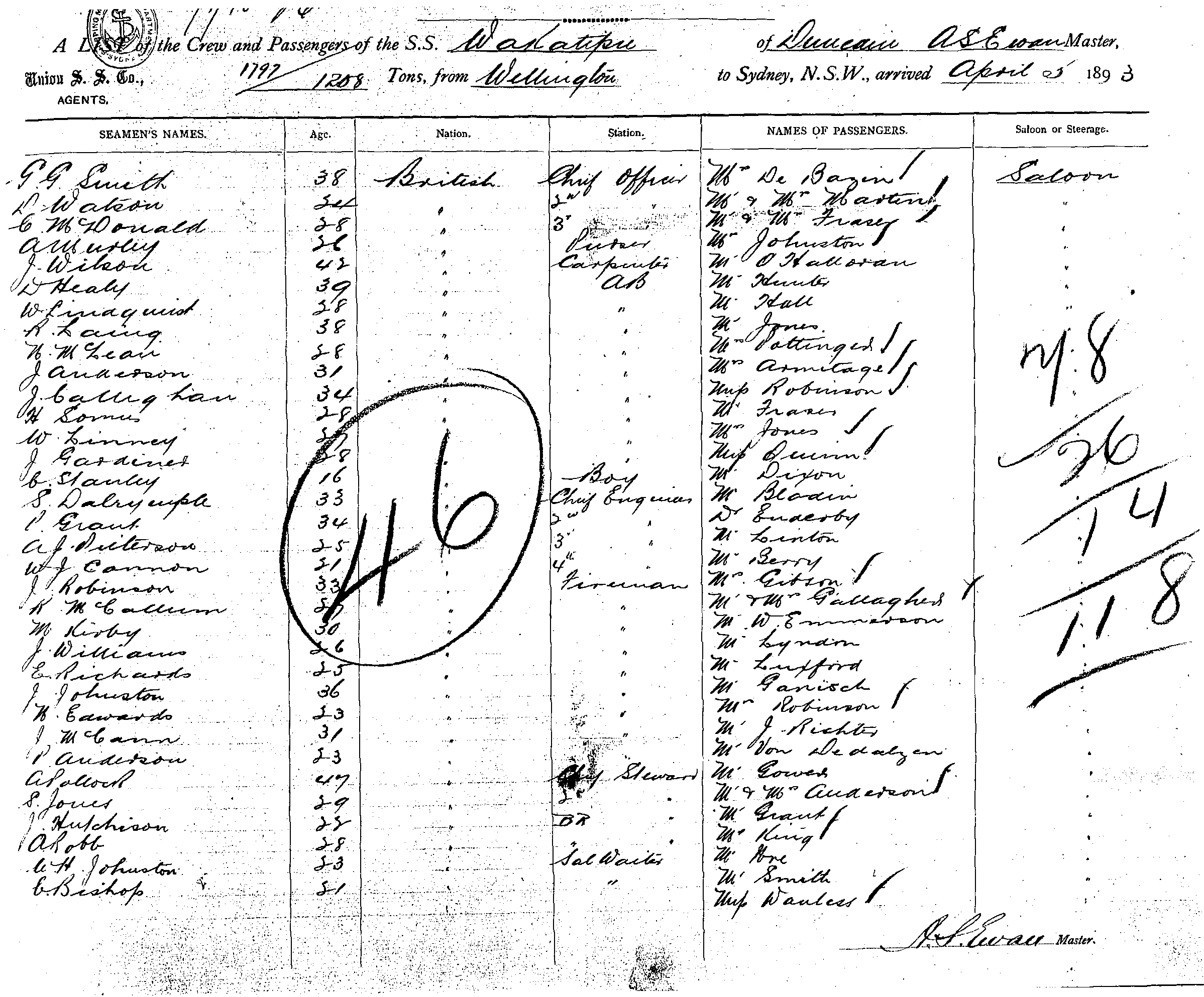 WAKATIPUOF DUNEDIN, A S EWAN, MASTER, BURTHEN 1797/1208 TONS FROM THE PORT OF WELLINGTON TO SYDNEY, NEW SOUTH WALES, 5 APR 1893 |
