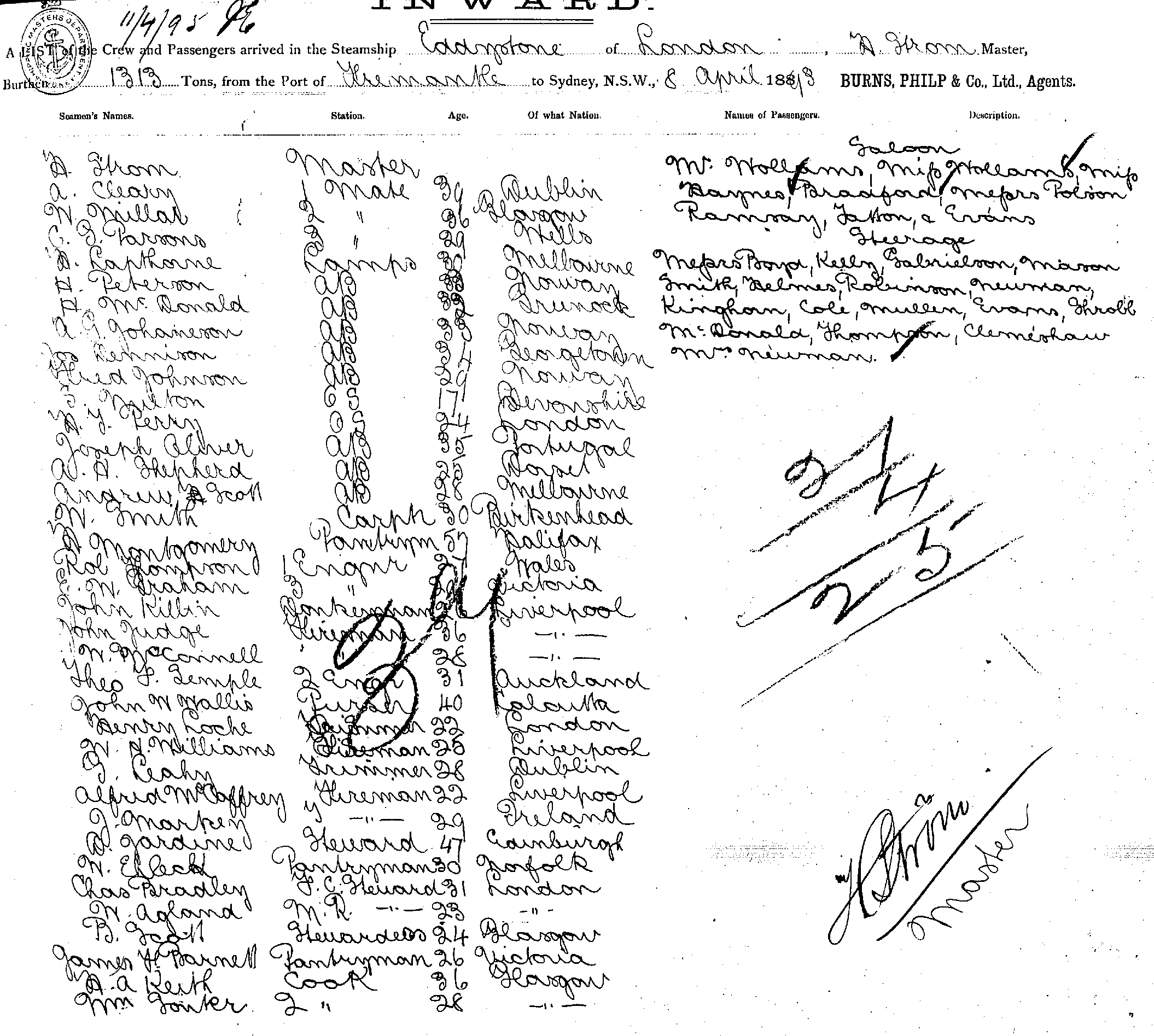 EDDYSTONEOF LONDON, H. STROM, MASTER, BURTHEN 1313 TONS FROM THE PORT OF FREMANTLE TO SYDNEY, NEW SOUTH WALES, 8 APRIL 1893 |