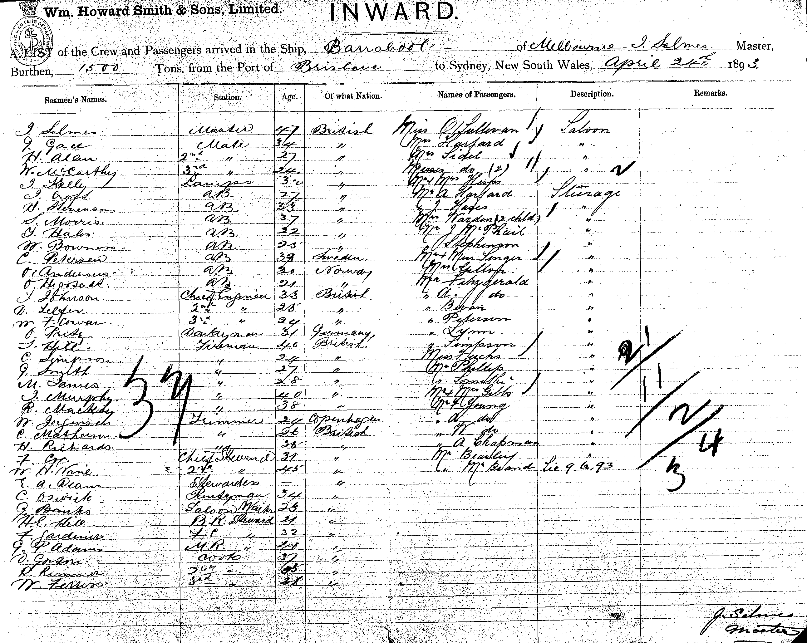 BARRABOOLOF MELBOURNE, J. SELMES, MASTER, BURTHEN 1500 TONS FROM THE PORT OF BRISBANE TO SYDNEY, NEW SOUTH WALES, 24 APRIL, 1893 |
