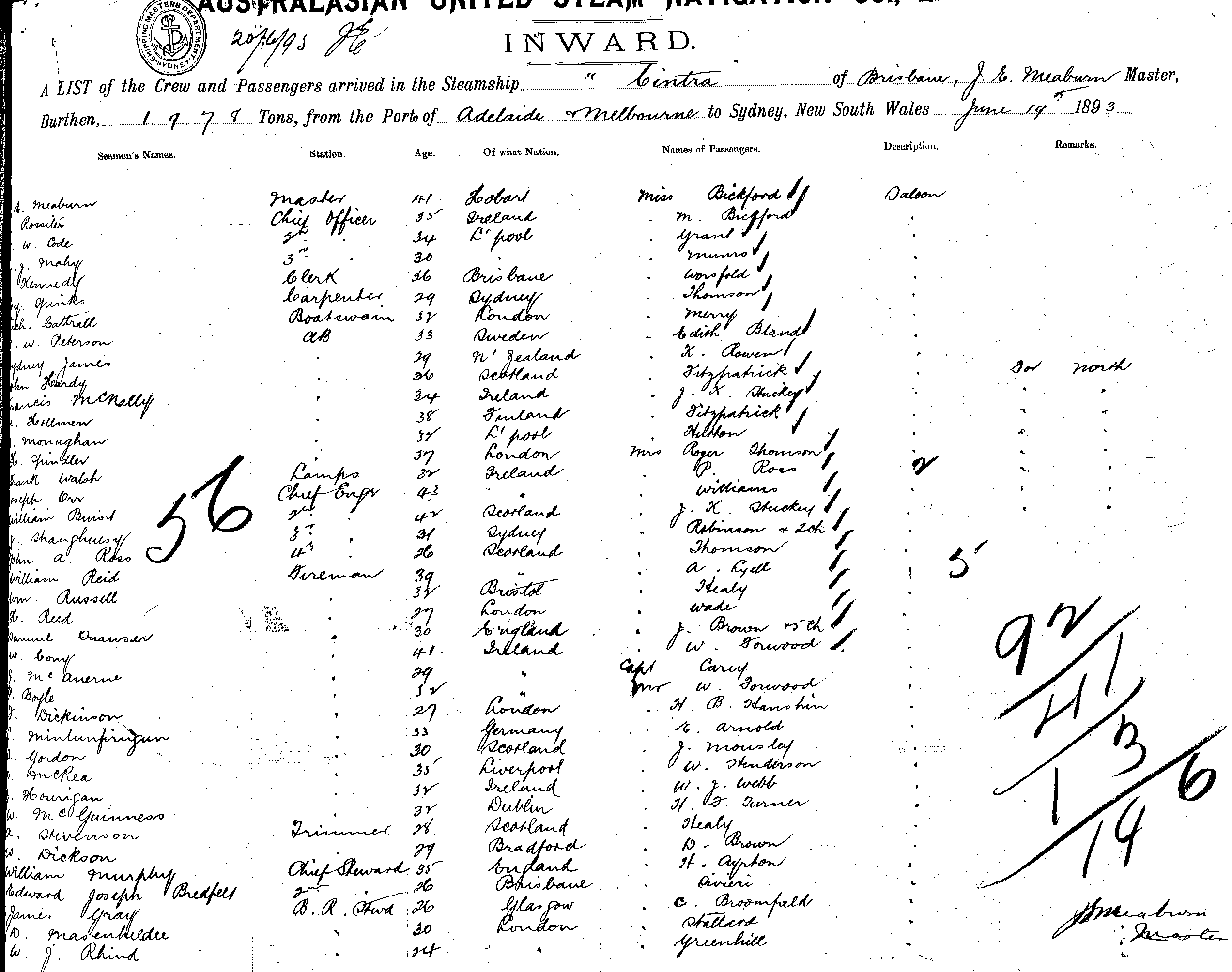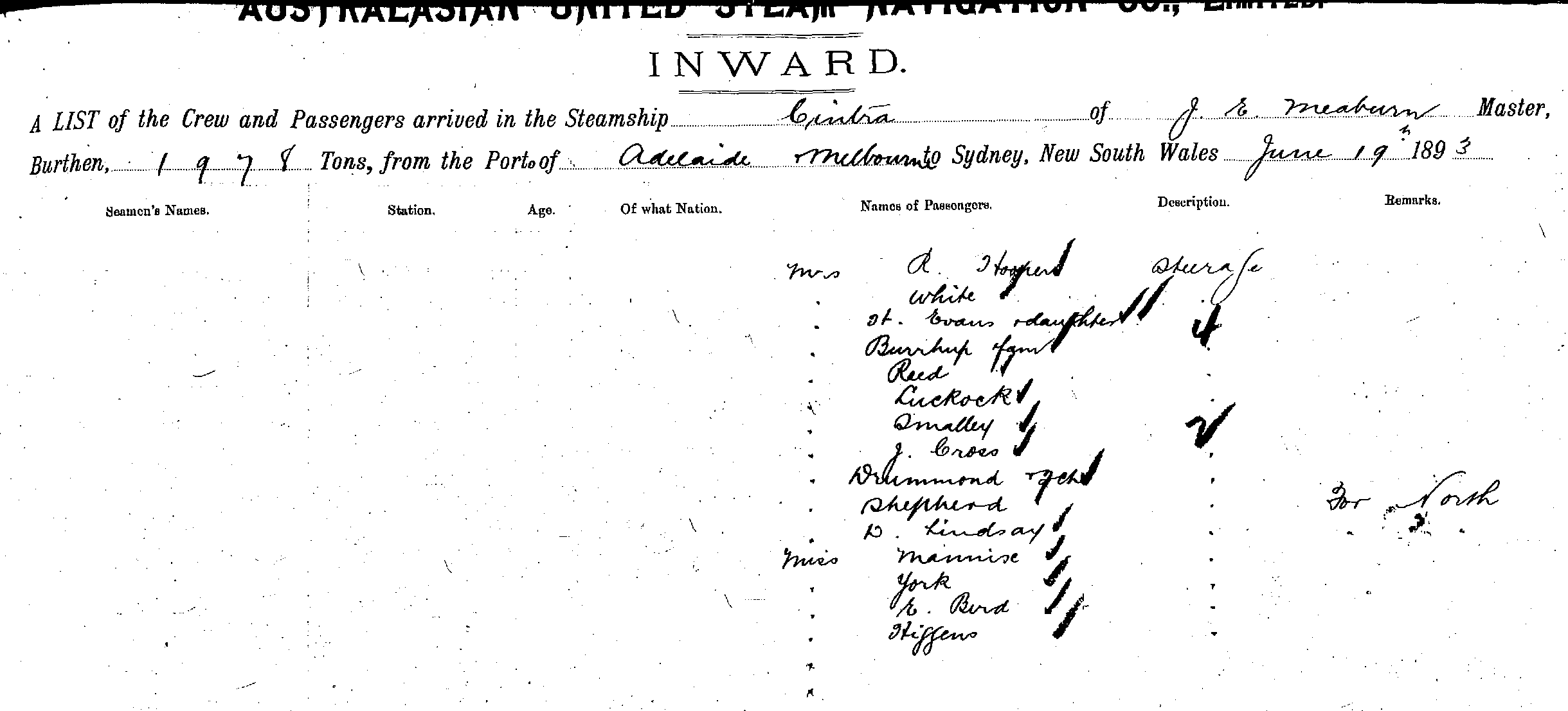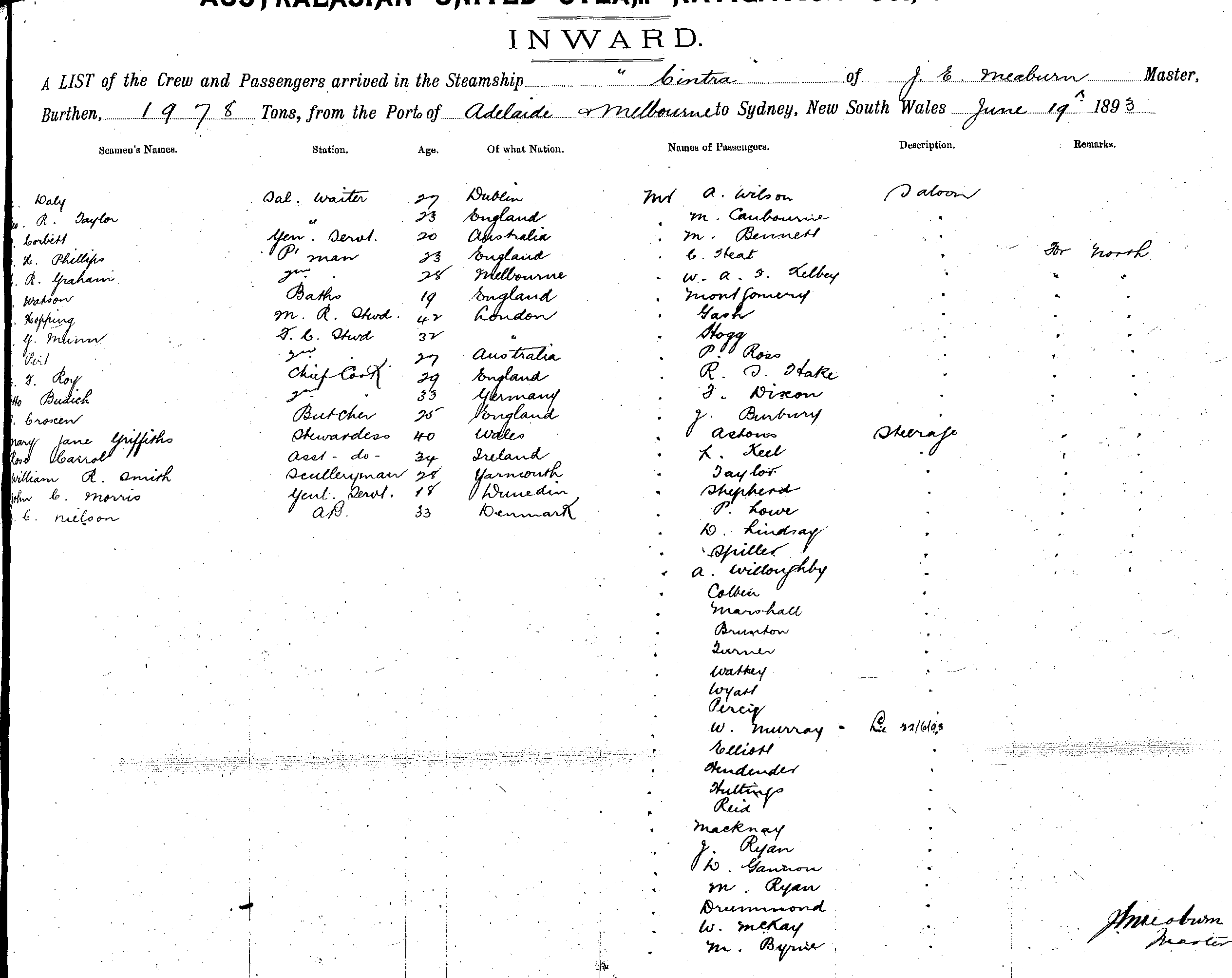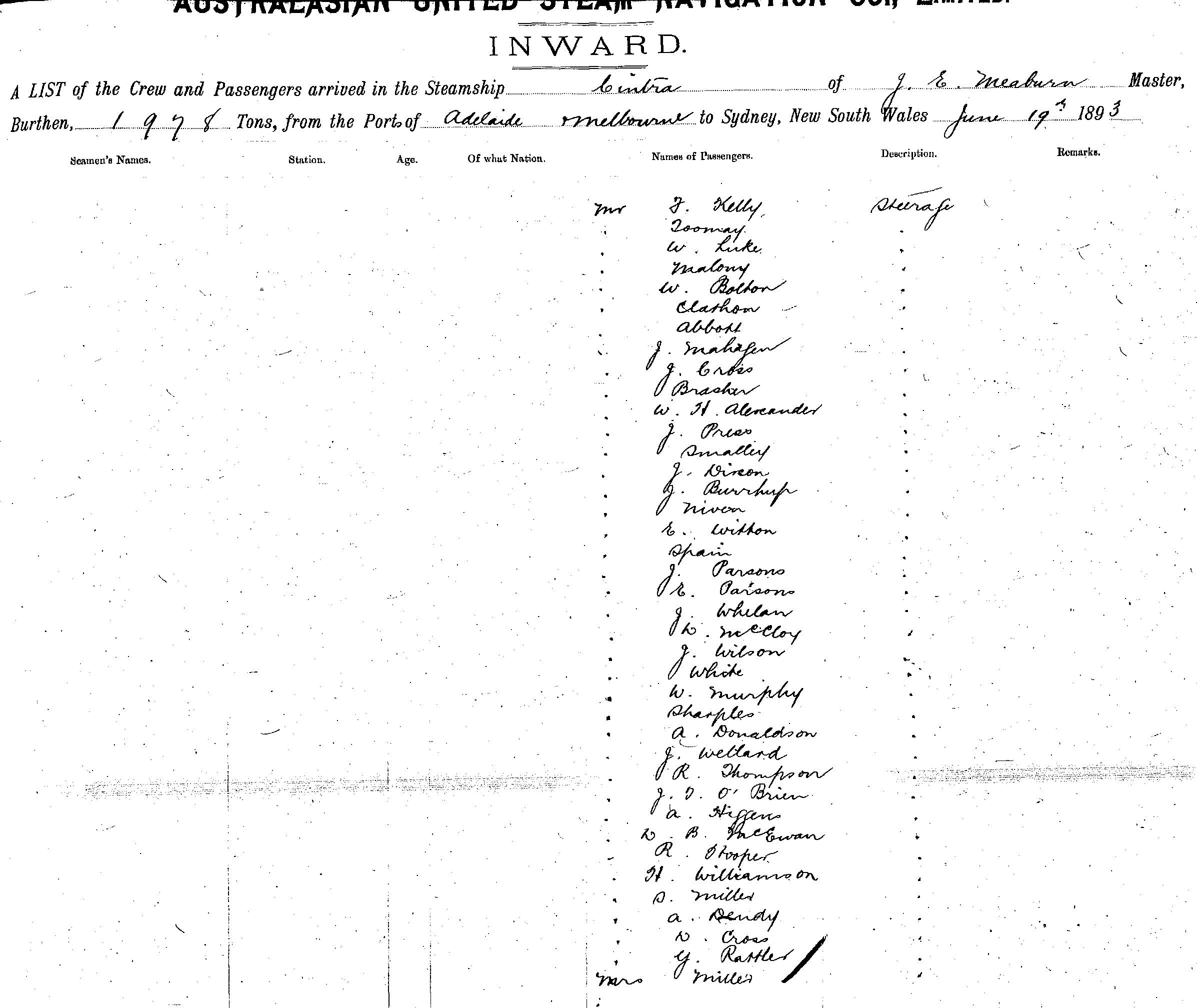 CINTRAOF BRISBANE, J. E. MEABURN, MASTER, BURTHEN 1978 TONS FROM THE PORT OF MELBOURNE TO SYDNEY, NEW SOUTH WALES, 19TH JUNE 1893 |