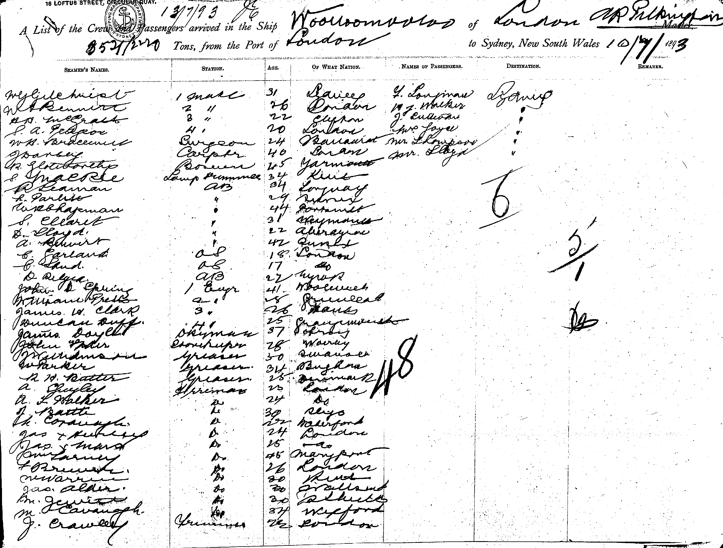 WOOLLOOMOOLOOOF LONDON, A. R. PILKINGTON, MASTER, BURTHEN 3521/2220 TONS FROM THE PORT OF LONDON, TO SYDNEY, NEW SOUTH WALES, JULY 10TH, 1893 |