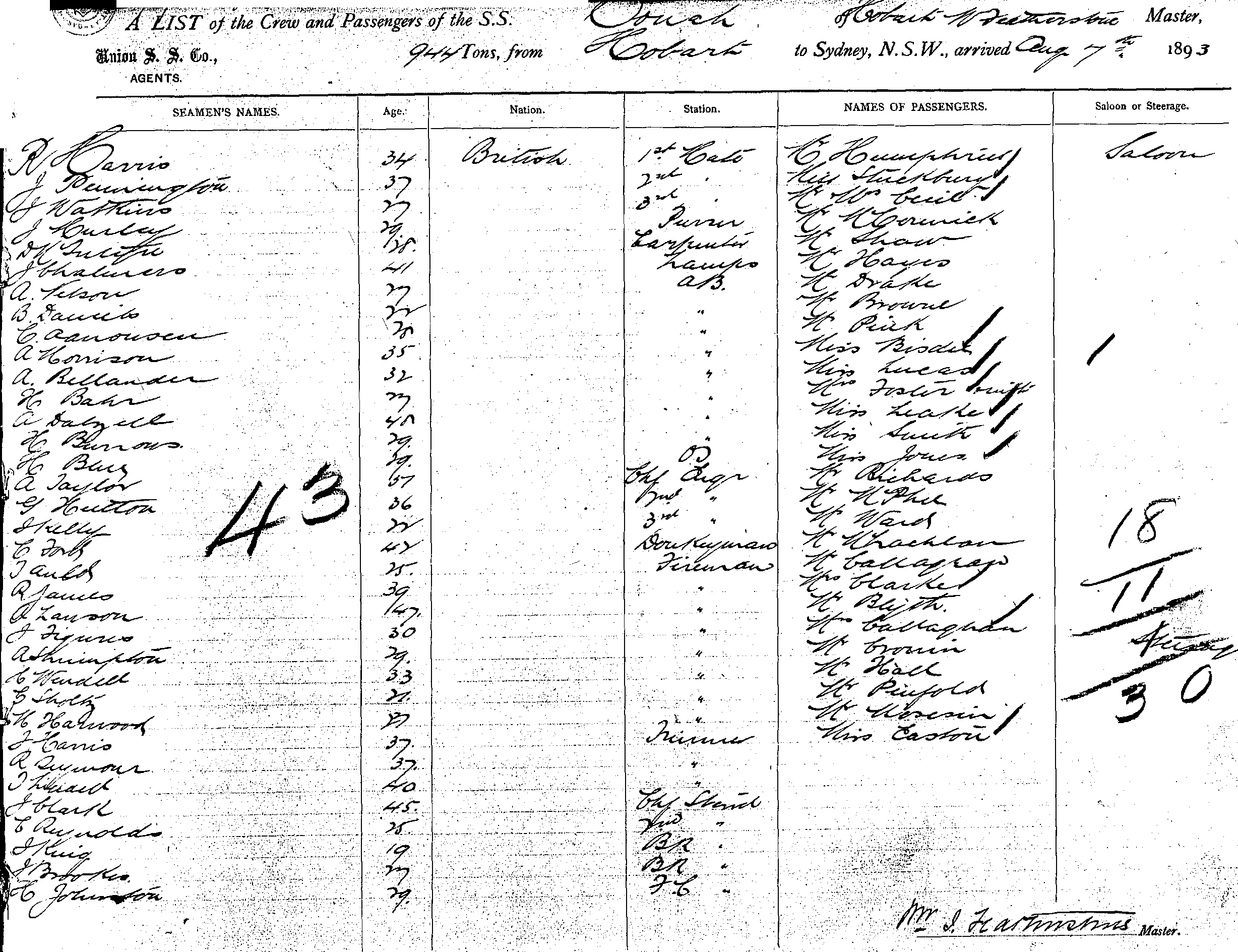 OONAHOF HOBART, W. FEATHERSTONE, MASTER, BURTHEN 944 TONS FROM THE PORT OF MELBOURNE TO SYDNEY, NEW SOUTH WALES, 7 AUG. 1893 |