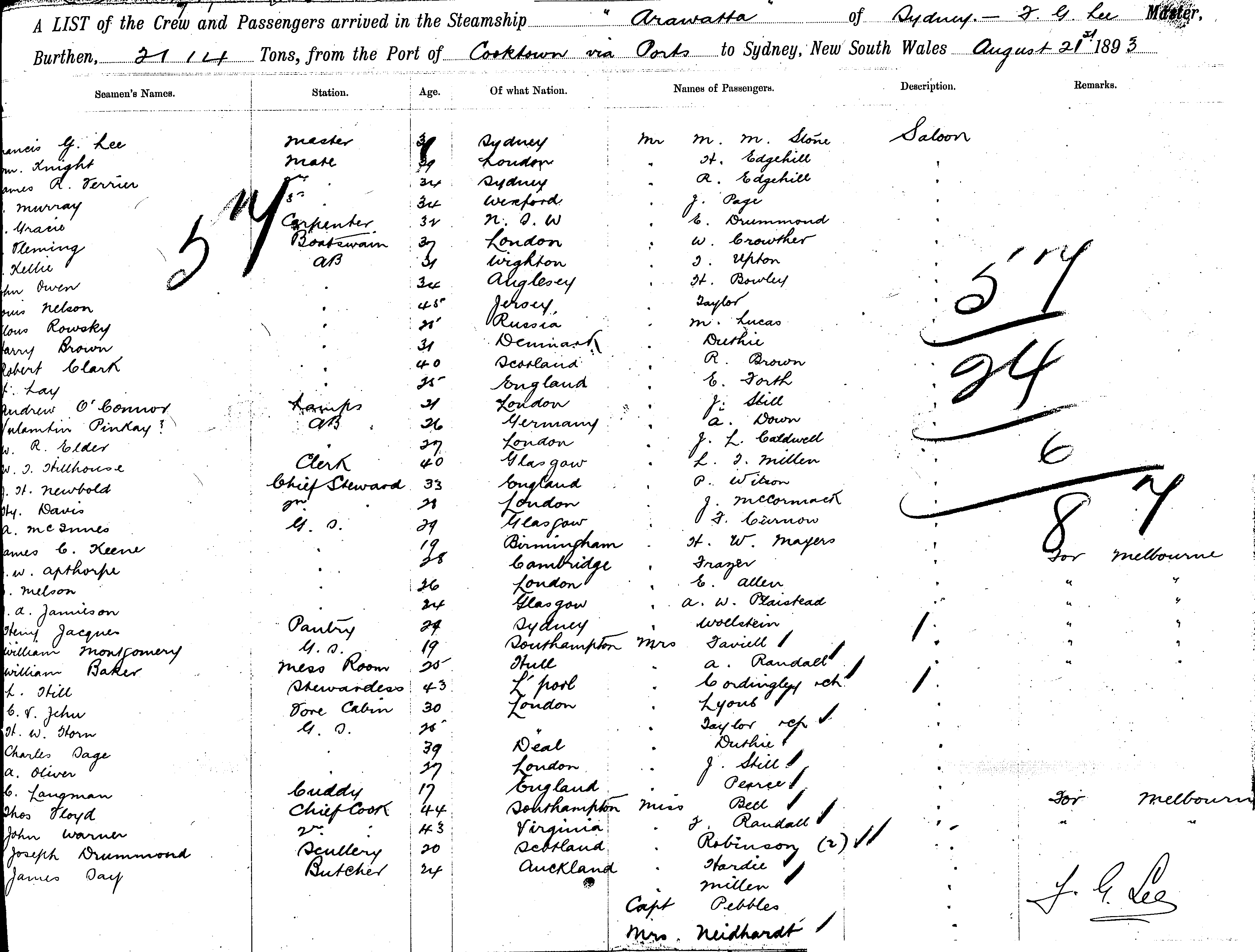 ARAWATTAOF SYDNEY, F.G. LEE, MASTER, BURTHEN 2114 TONS FROM THE PORT OF COOKTOWN VIA PORTS TO SYDNEY, NEW SOUTH WALES, 21ST AUGUST, 1893 |