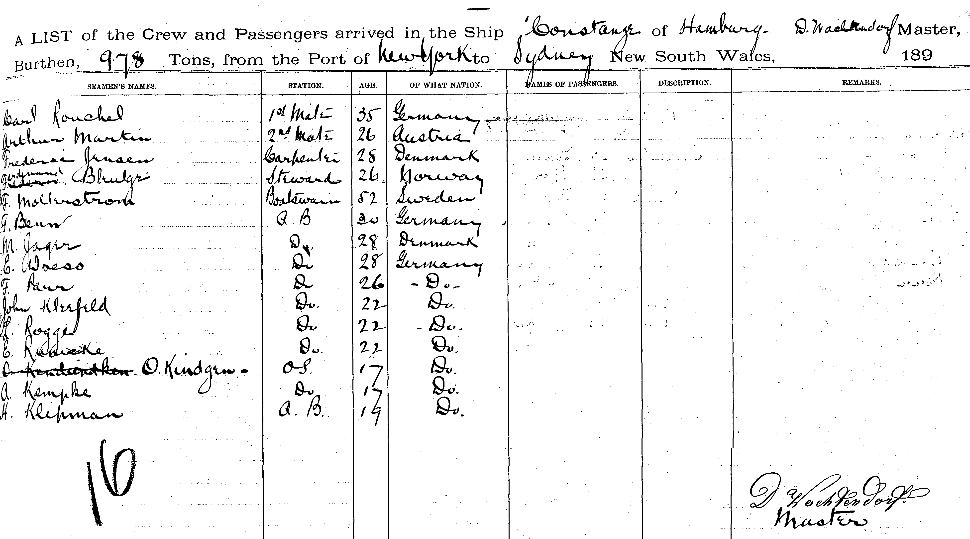 CONSTANZEOF HAMBURG, D. WACHTENDORF, MASTER, BURTHEN 978 TONS FROM THE PORT OF NEW YORK TO SYDNEY NEW SOUTH WALES, OCT, 1893 |