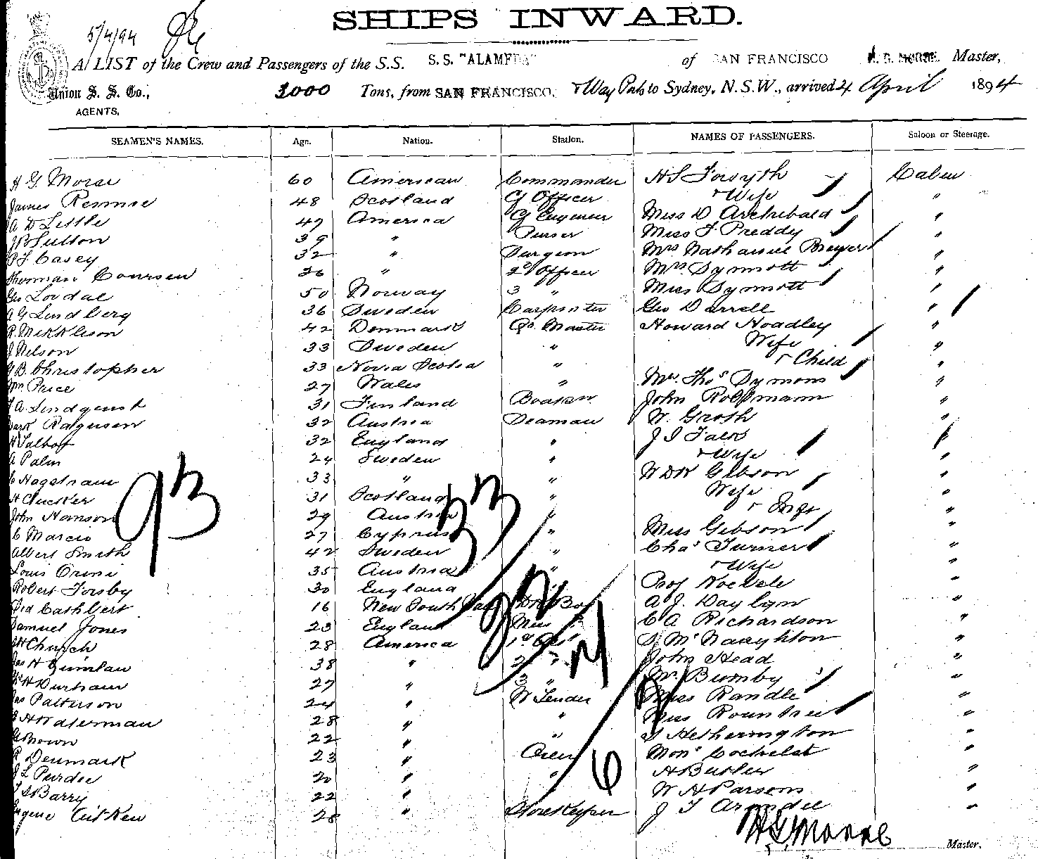 ALAMEDAOF SAN FRANCISCO, H G MORSE, MASTER, BURTHEN 3000 TONS FROM THE PORT OF SAN FRANCISCO & WAY PORTS TO SYDNEY, NEW SOUTH WALES, 4TH APRIL 1894 |