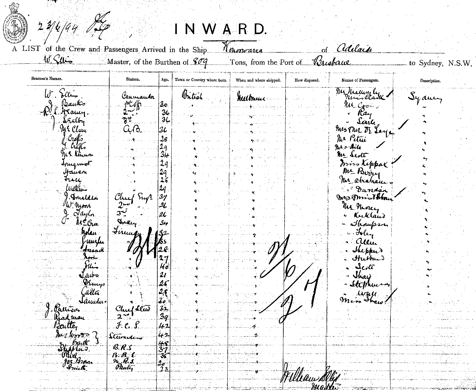 KONOOWARRAOF ADELAIDE, WILLIAM ELLIS, MASTER, BURTHEN 809 TONS FROM THE PORT OF BRISBANE TO SYDNEY, NEW SOUTH WALES, 23RD JUNE 1894 |