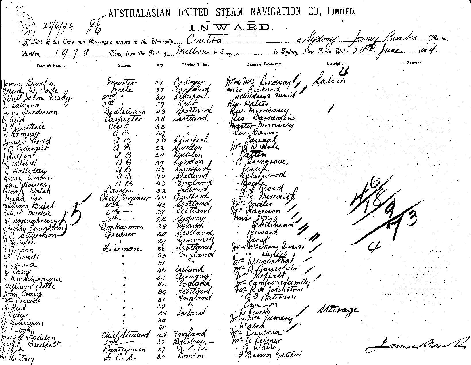 CINTRAOF SYDNEY, JAMES BANKS, MASTER, BURTHEN 1978 TONS FROM THE PORT OF MELBOURNE TO SYDNEY, NEW SOUTH WALES, 25TH JUNE 1894 |