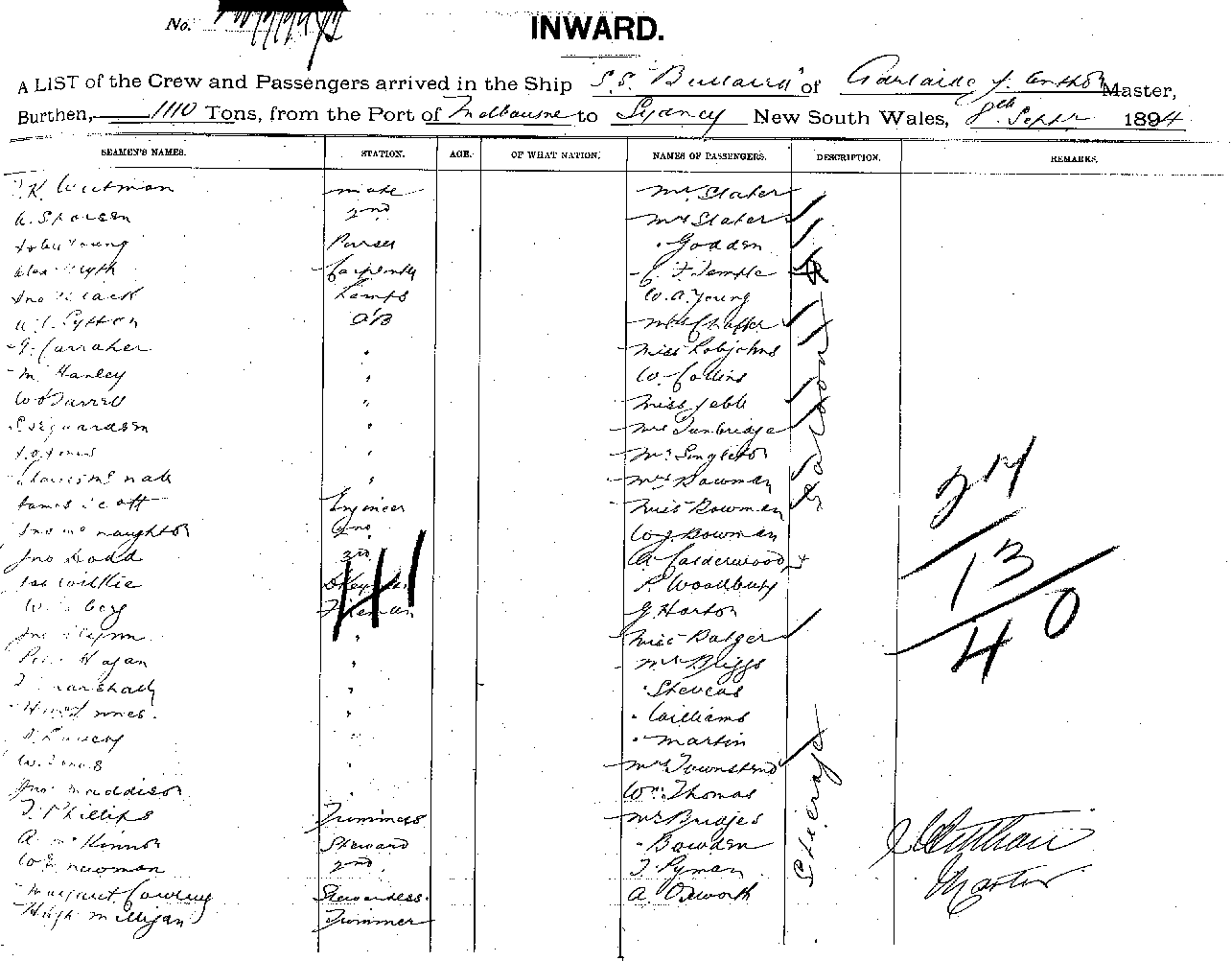 Source: State Records Authority of New South Wales: Shipping Master's Office; Passengers Arriving 1855 - 1922; NRS13278, [X231] reel 523. Transcribed by Dorothy D'Arcy.