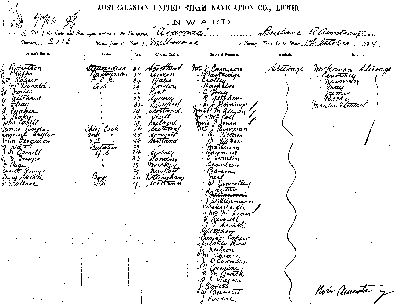 ARAMACOF BRISBANE, R. ARMSTRONG, MASTER, BURTHEN 2113 TONS FROM THE PORT OF MELBOURNE TO SYDNEY, NEW SOUTH WALES, 1ST OCTOBER, 1894 |