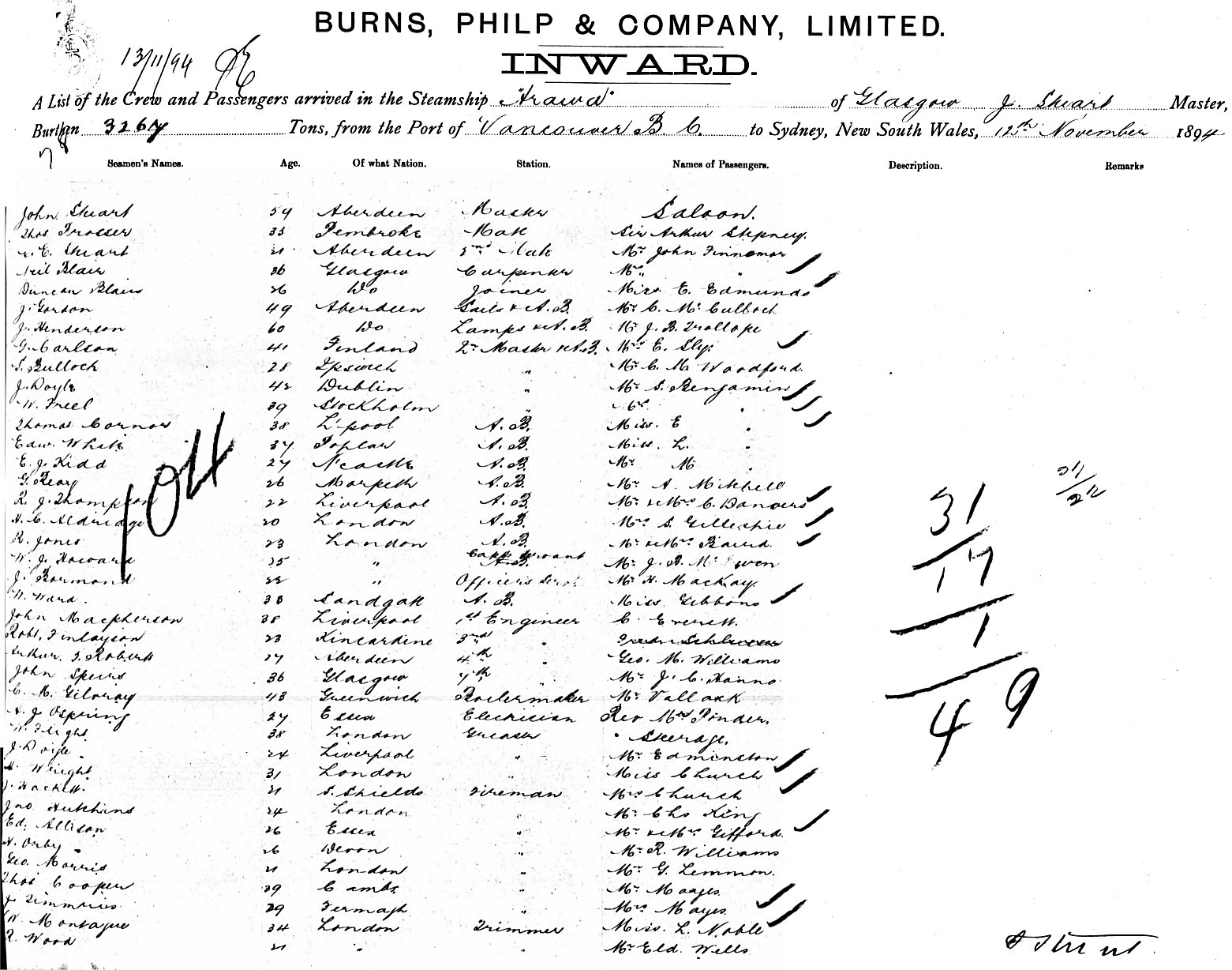 ARAWAOF GLASGOW, J STUART, MASTER, BURTHEN 3267 TONS FROM THE PORT OF VANCOUVER BC TO SYDNEY, NEW SOUTH WALES, 12TH NOVEMBER 1894 |