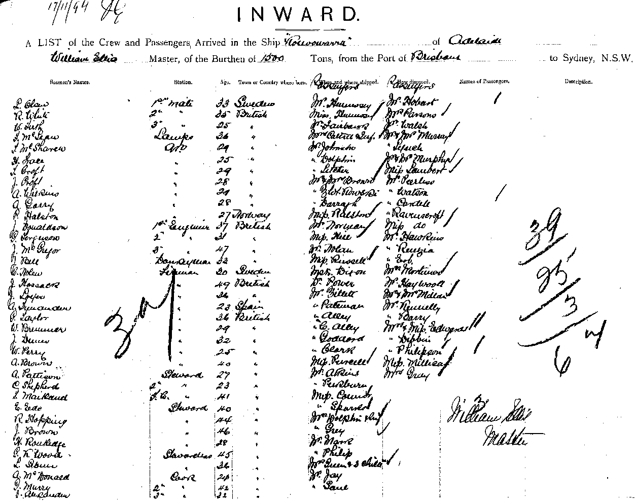 KONOOWARRAOF ADELAIDE, WILLIAM ELLIS, MASTER, BURTHEN 1500 TONS FROM THE PORT OF BRISBANE TO SYDNEY, NEW SOUTH WALES, 16TH NOVEMBER 1894 |