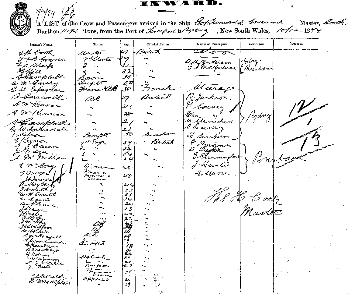 FROM THE PORT OF LIVERPOOL TO SYDNEY, NEW SOUTH WALES, 10 DECEMBER 1894
