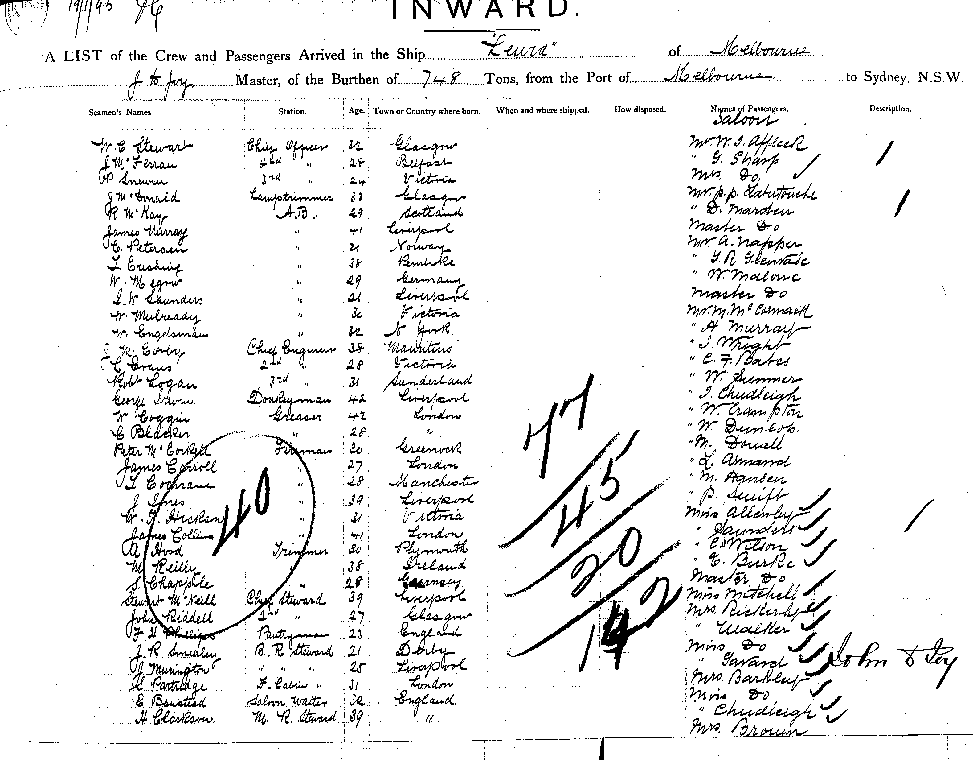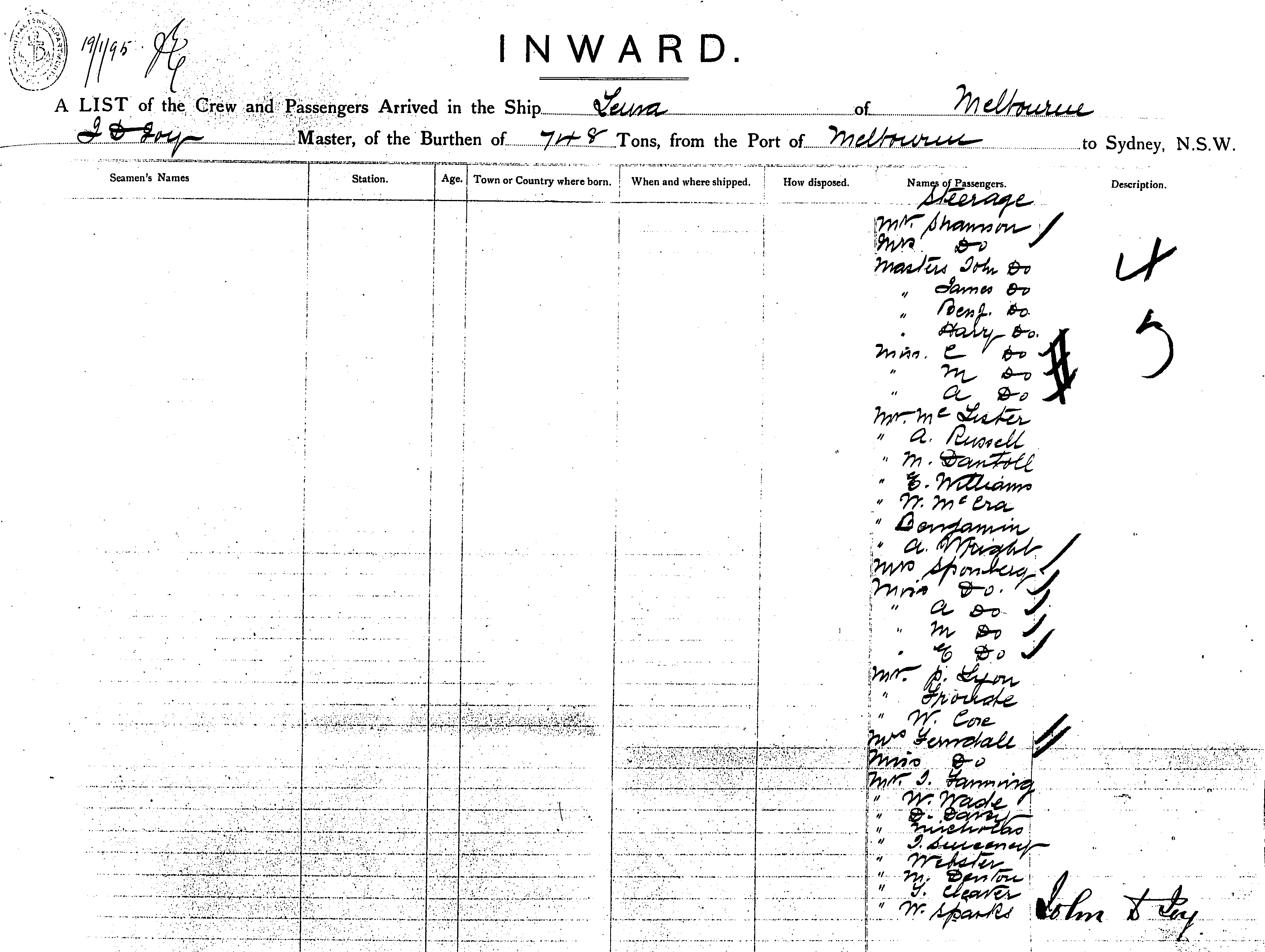 LEURAOF MELBOURNE, JOHN D. JOY, MASTER, BURTHEN 748 TONS FROM THE PORT OF MELBOURNE TO SYDNEY, NEW SOUTH WALES, 19TH JAN, 1895 |