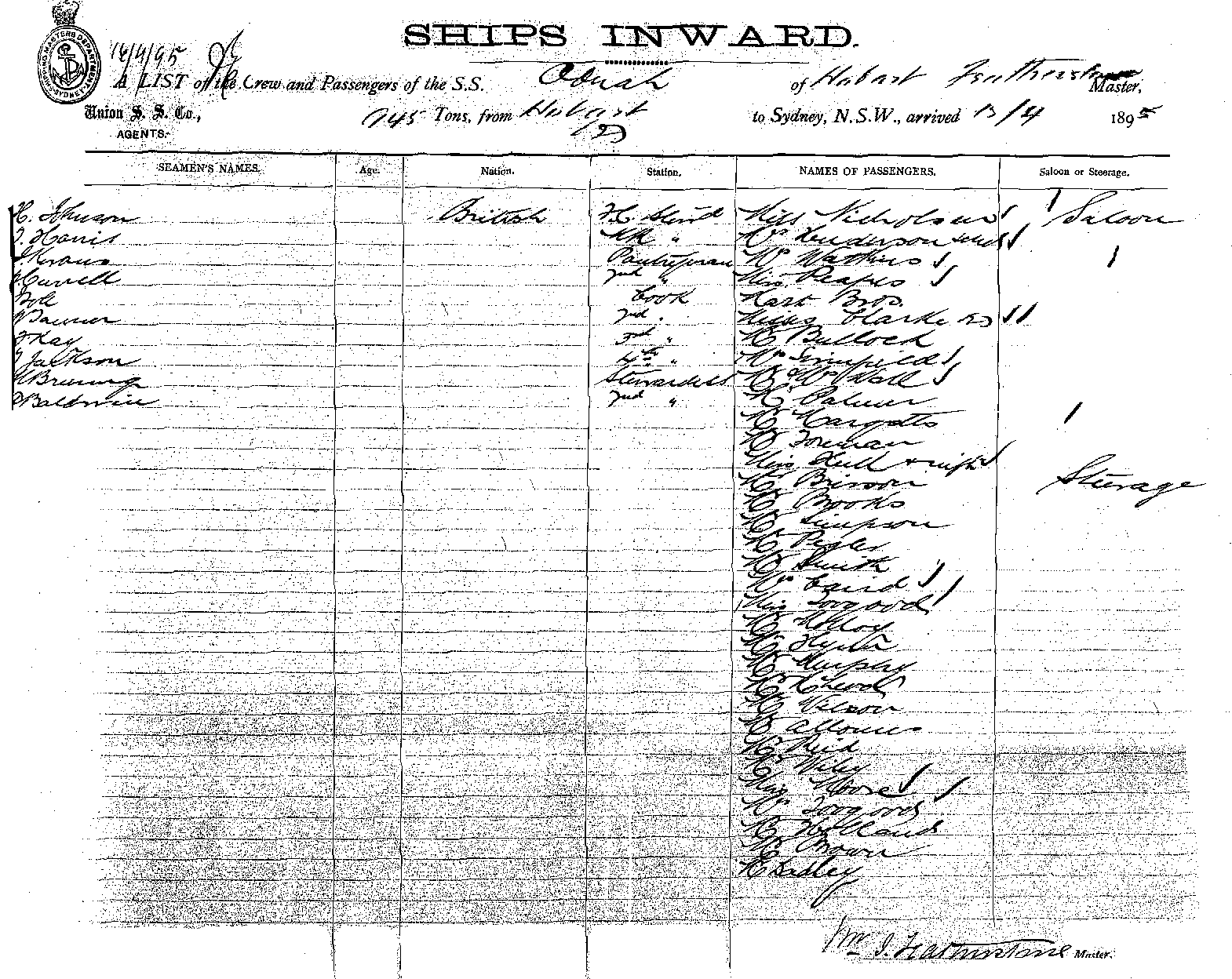 OONAHSTEAMSHIP OF HOBART, WILLIAM J. FEATHERSTONE, MASTER, BURTHEN 944 TONS FROM THE PORT OF HOBART TO SYDNEY, NEW SOUTH WALES, 12TH APRIL 1895 |