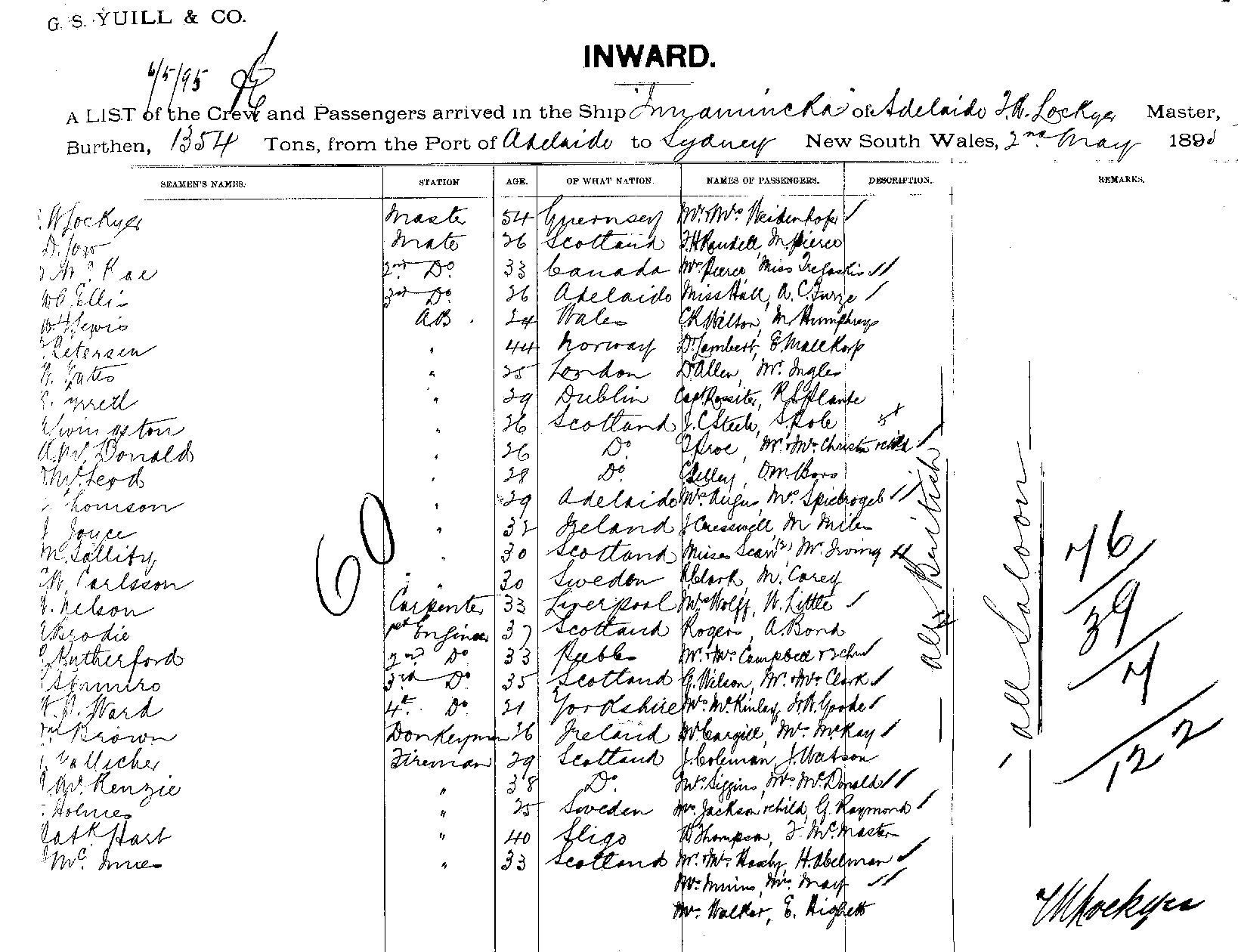 INNAMINKAOF ADELAIDE, T. W. LOCKYER, MASTER, BURTHEN 1354 TONS FROM THE PORT OF ? TO SYDNEY, NEW SOUTH WALES, 2ND MAY 1895 |