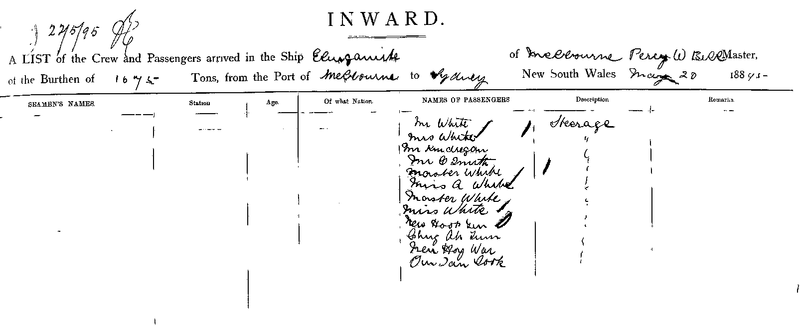 ELINGAMITEOF MELBOURNE, PERCY W. BULL, MASTER, BURTHEN 1673 TONS FROM THE PORT OF MELBOURNE TO SYDNEY, NEW SOUTH WALES, 20TH MAY 1895 |