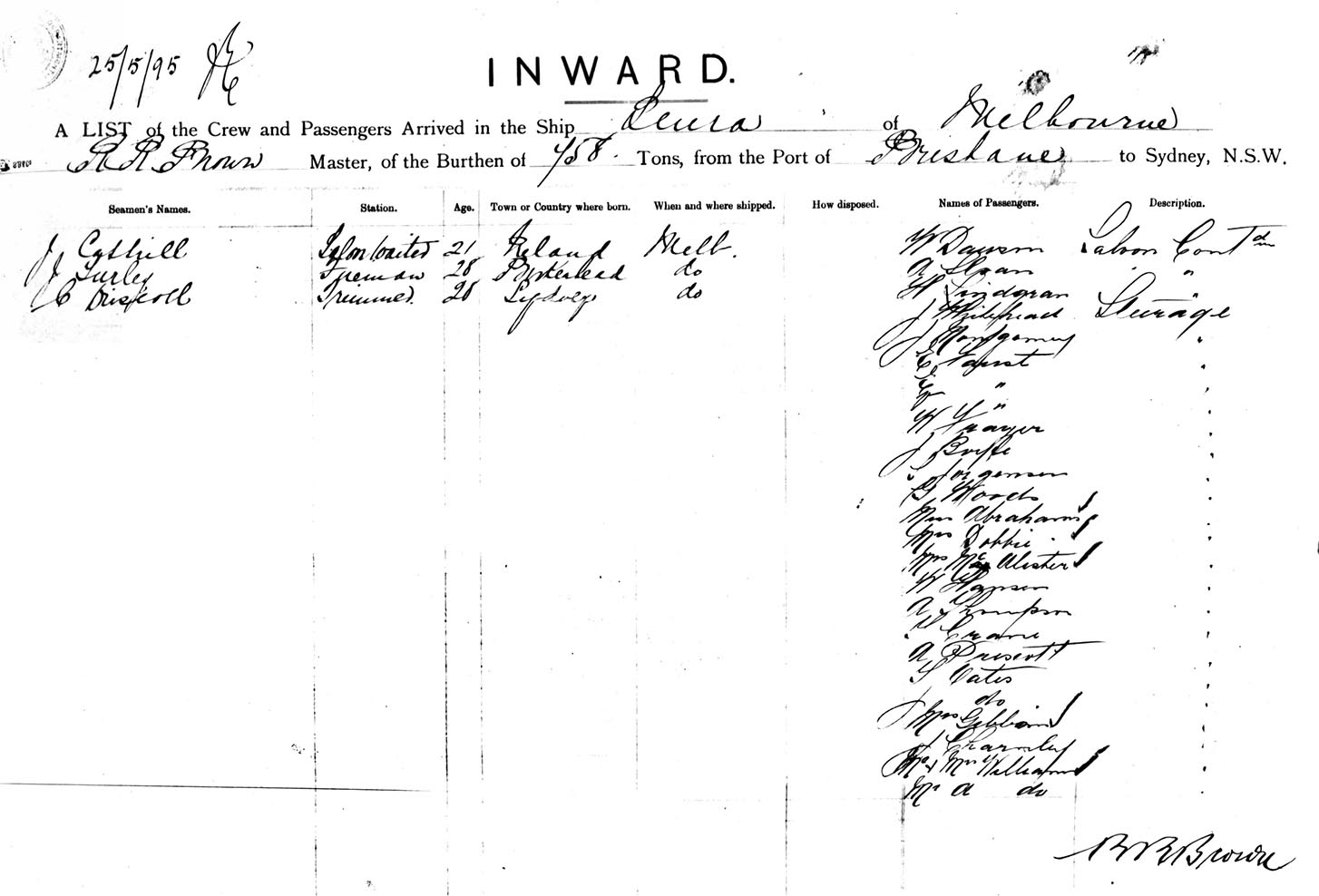 LEURAOF MELBOURNE, R. R. BROWN, MASTER, BURTHEN 758 TONS FROM THE PORT OF BRISBANE TO SYDNEY, NEW SOUTH WALES, 25TH MAY 1895 |