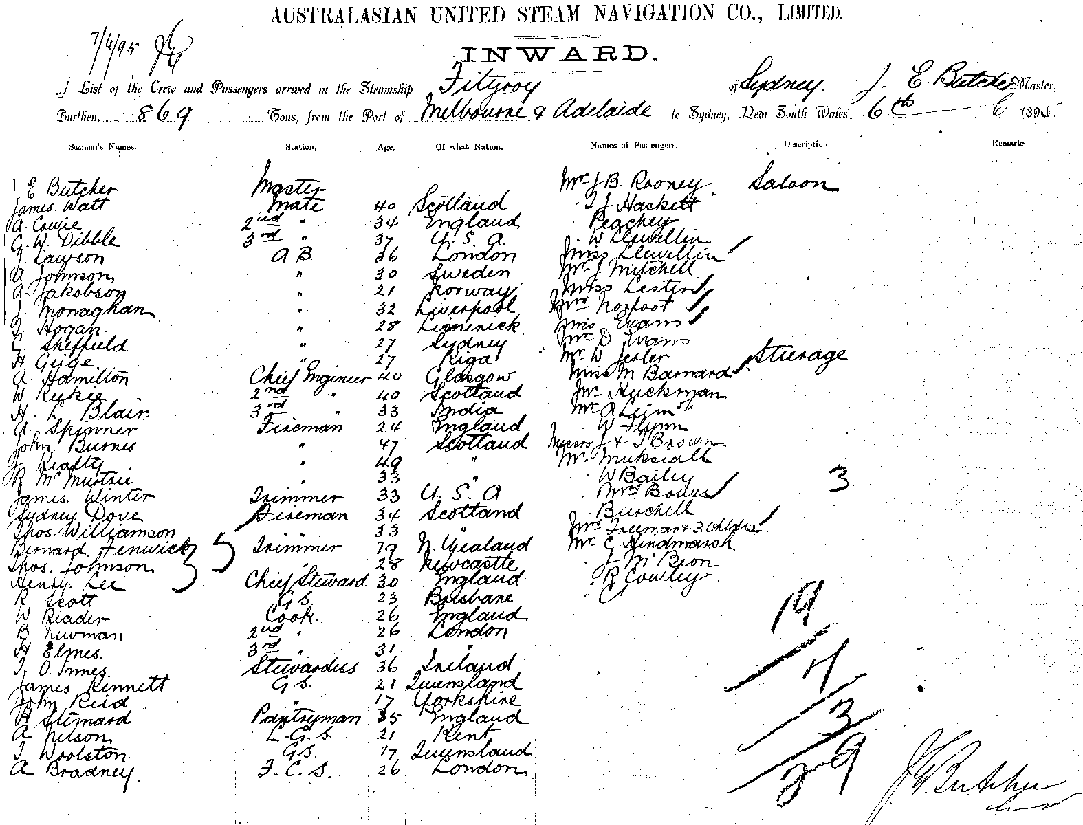 FITZROYOF SYDNEY, J. E. BUTCHER, MASTER, BURTHEN 869 TONS FROM THE PORT OF MELBOURNE & ADELAIDE TO SYDNEY, NEW SOUTH WALES, 6TH JUNE 1895 |