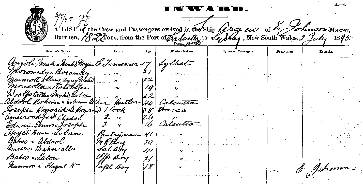 ARGUSOF ?, E JOHNSON, MASTER, BURTHEN 1822 TONS FROM THE PORT OF CALCUTTA TO SYDNEY, NEW SOUTH WALES, 2 JULY 1895 |