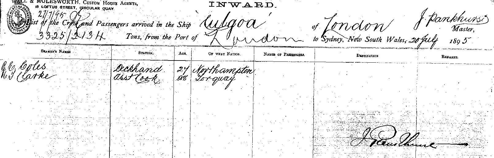 CULGOAOF LONDON, J PANKHURST, MASTER, BURTHEN 3325/2134 TONS FROM THE PORT OF LONDON TO SYDNEY, NEW SOUTH WALES, 20 JULY 1895 |